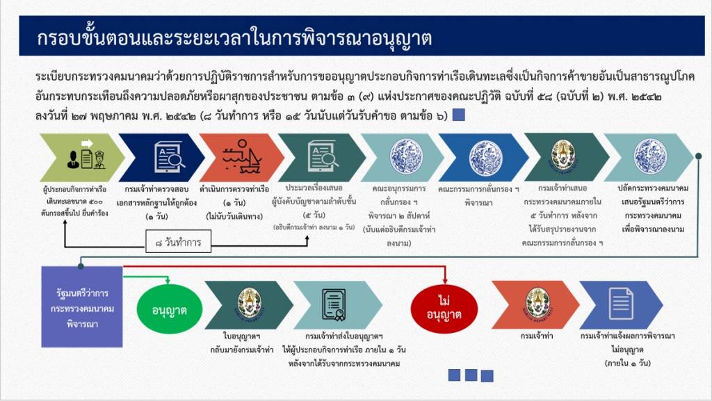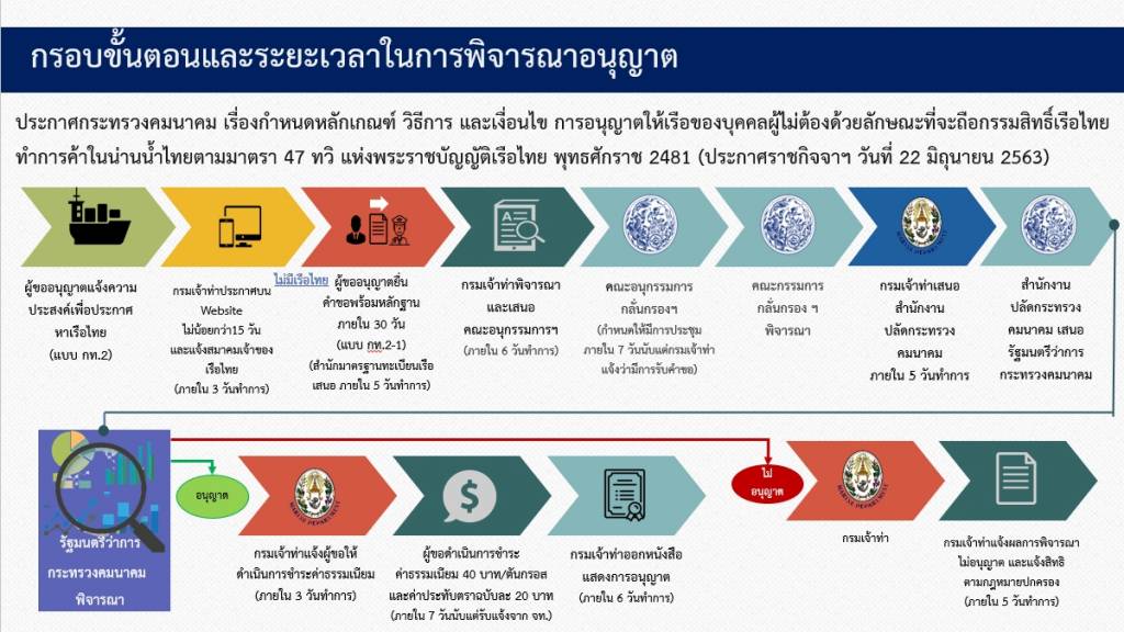 ที่ประชุมพิจารณาเห็นชอบอนุญาตให้เรือของบุคคลผู้ไม่ต้องด้วยลักษณะที่จะถือกรรมสิทธิ์เรือไทยทำการค้าในน่านน้ำไทย ตามมาตรา 47 ทวิ แห่งพระราชบัญญัติเรือไทย พุทธศักราช 2481 จำนวน 4 ลำ เข้ามาประกอบกิจการเฉพาะเท่าที่มีเอกชนร้องขออนุญาต และเป็นการเฉพาะตราบเท่าที่ได้รับการยืนยันจากสมาคมเจ้าของเรือไทย ว่าไม่มีเรือไทย สนใจเข้ามาประกอบกิจการ และเป็นไปตามหลักเกณฑ์ ประกาศ ตาม checklist ที่กฎหมายกำหนดทุกประการ ทั้งนี้ เพื่อให้ การดำเนินการในกิจการต่าง ๆ ตามวัตถุประสงค์แห่งสัญญาการว่าจ้างเรือของเอกชน เป็นไปเพื่อประโยชน์สมตามวัตถุประสงค์เท่าที่จำเป็น และคงรักษาประโยชน์ของธุรกิจประกอบกิจการเรือของไทย