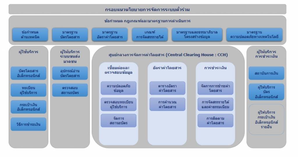 2) กรอบแนวนโยบายการบริหารจัดการตั๋วร่วม มีการแบ่งเป็นส่วนของผู้ใช้บริการ ส่วนของผู้ให้บริการระบบขนส่งสาธารณะ ศูนย์กลางจัดการค่าโดยสาร (Central Clearing House) และส่วนผู้ให้บริการชำระเงิน