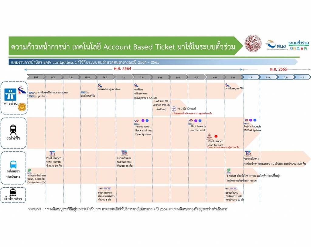 นอกจากนี้ ในที่ประชุมหน่วยงานที่เป็นผู้ให้บริการระบบขนส่งสาธารณะ ได้มีการรายงานความก้าวหน้าในการดำเนินการพัฒนาและประยุกต์ใช้ระบบตั๋วร่วม ประกอบด้วย 1) การรถไฟฟ้าขนส่งมวลชนแห่งประเทศไทย (รฟม.) ได้รายงานต่อที่ประชุมว่ากำลังดำเนินการพัฒนาระบบตั๋วร่วมโดยใช้เทคโนโลยี Account Based Ticketing (ABT) โดยในปัจจุบันการออกแบบระบบแล้วเสร็จ อยู่ระหว่างการพัฒนาซอฟแวร์ และติดตั้งระบบ โดยได้ทำการทดสอบระบบครั้งแรก ที่สถานีหัวลำโพง และสถานีสนามไชยเมื่อต้นเดือนกรกฎาคมที่ผ่านมา ผลปรากฏว่าระบบใช้งานได้ถูกต้อง ตามแผนงานจะดำเนินการทุกอย่างแล้วเสร็จภายในสิ้นปี 2564 และสามารถเปิดให้ประชาชนใช้งานระบบได้ในต้นปี 2565