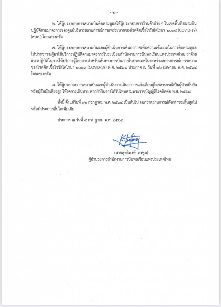 8.ให้ผู้ประกอบการสนามบินและผู้ดำเนินการเดินอากาศแจ้งเตือนผู้โดยสารกรณีเป็นผู้ป่วยยืนยัน หรือผู้สัมผัสเสี่ยงสูง ให้งดการเดินทาง หากฝ่าฝืนอาจได้รับโทษตามพระราชบัญญัติโรคติดต่อ พ.ศ.2558