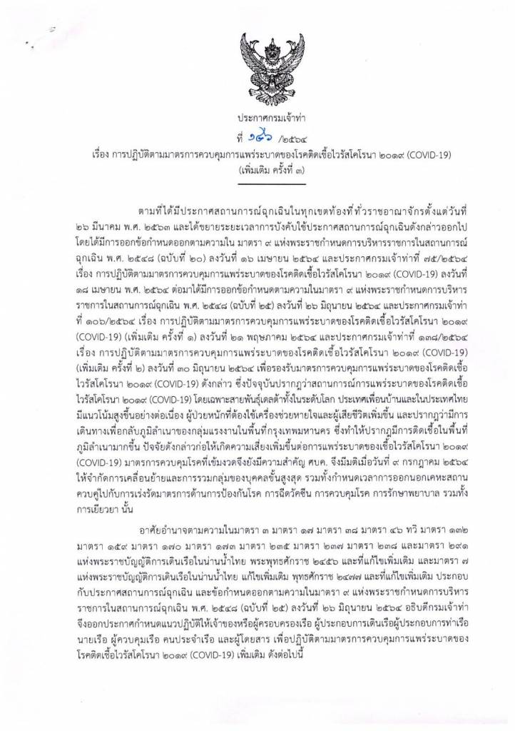 ทั้งนี้เพื่อเป็นการยกระดับการดำเนินมาตรการเฝ้าระวังป้องกันโรคที่สอดคล้องกับข้อกำหนดดังกล่าว สำนักงานการบินพลเรือนแห่งประเทศไทยจึงออกประกาศกำหนดแนวปฏิบัติ ดังนี้ 1. ให้ยกเลิกประกาศสำนักงานการบินพลเรือนแห่งประเทศไทย เรื่อง แนวปฏิบัติสำหรับ ผู้ประกอบการสนามบินและผู้ดำเนินการเดินอากาศในเส้นทางการบินภายในประเทศในระหว่างสถานการณ์ การระบาดของโรคติดเชื้อไวรัสโคโรนา 2019 (COVID-19) ประกาศ ณ วันที่ 17เมษายน พ.ศ.2564 และ ให้ใช้ประกาศฉบับนี้แทน