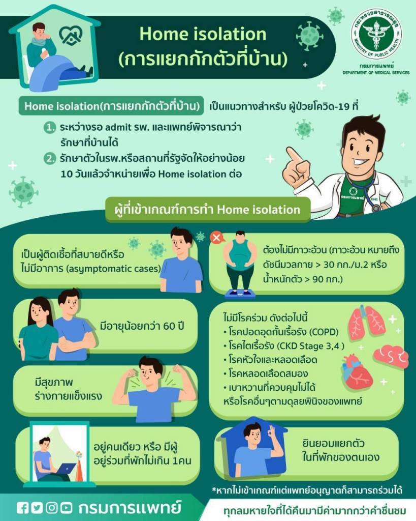 สำหรับเกณฑ์พิจารณาผู้ป่วย Home Isolation จะต้องเป็นผู้ติดเชื้อที่ไม่มีอาการ อายุไม่เกิน 60 ปี อยู่คนเดียวหรือมีผู้อยู่ร่วมที่พักไม่เกิน 1 คน ไม่มีภาวะอ้วน ไม่มีโรคร่วม เช่น ปอดอุดกั้นเรื้อรัง โรคไตเรื้อรัง โรคหัวใจและหลอดเลือด โรคหลอดเลือดสมอง เบาหวานที่ควบคุมไม่ได้ และยินยอมแยกตัวในที่พักของตนเอง โดยสถานพยาบาลจะประเมินผู้ติดเชื้อตามดุลยพินิจของแพทย์ ลงทะเบียน แนะนำการปฏิบัติตัว ติดตามประเมินอาการ และรับส่งผู้ป่วยมารักษาในสถานพยาบาลหากมีอาการรุนแรงขึ้น ซึ่งโครงการนี้ได้เริ่มทำแล้วที่โรงพยาบาลราชวิถี จำนวน 20 ราย ได้ผลดี ทุกรายอาการดีขึ้น