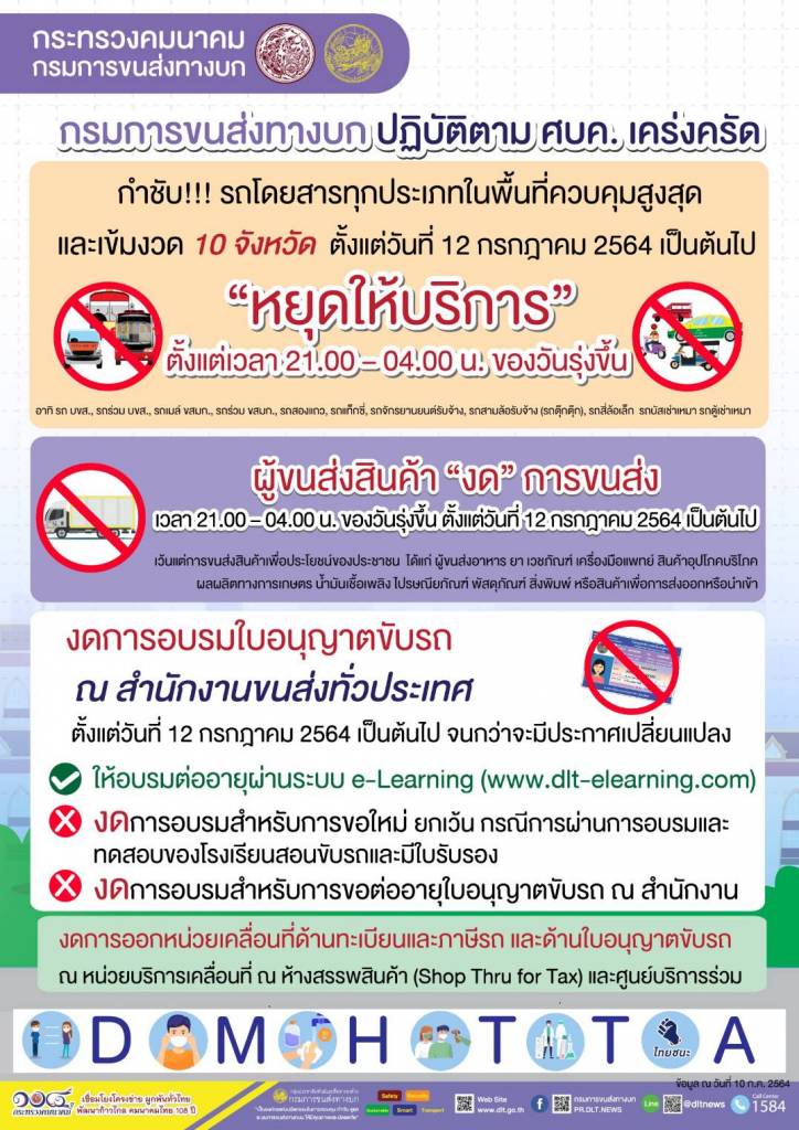 กรมการขนส่งทางบก กำชับ!!! รถโดยสารทุกประเภทในพื้นที่ควบคุมสูงสุดและเข้มงวด 10 จังหวัด หยุดให้บริการตั้งแต่เวลา 21.00 – 04.00 น. ของวันรุ่งขึ้น ตั้งแต่วันที่ 12 กรกฎาคม 2564 เป็นต้นไป และปฏิบัติตาม ศบค. เคร่งครัด พร้อมแจ้ง!!! “งดอบรมใบขับขี่ที่สำนักงานทั่วประเทศ” อีกครั้ง ภายใต้มาตรการสาธารณสุขป้องกันโควิด-19 เข้มข้น ส่วนกรณีใบขับขี่หาย หรือการต่ออายุใบขับขี่ที่ผ่านการอบรมออนไลน์ ให้จองคิวล่วงหน้าก่อนมาดำเนินการ