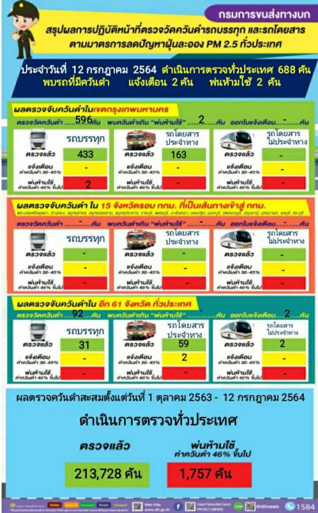วันนี้ (12 กรกฎาคม 2564) นายจิรุตม์ วิศาลจิตร อธิบดีกรมการขนส่งทางบก เผยผลการดำเนินการตรวจควันดำรถบรรทุกและรถโดยสารทั่วประเทศ ซึ่งเป็นการดำเนินการต่อเนื่อง ตามนโยบายของนายศักดิ์สยาม ชิดชอบ รัฐมนตรีว่าการกระทรวงคมนาคม เพื่อป้องกันและแก้ไขปัญหาฝุ่นละอองขนาดเล็ก PM2.5 เฉพาะวันที่ 12 กรกฎาคม 2564 ดำเนินการตรวจวัดควันดำรถโดยสารและรถบรรทุกทั่วประเทศ จำนวน 688 คัน พบรถที่มีค่าควันดำเกินเกณฑ์มาตรฐานที่ราชการกำหนด จำนวน 2 คัน ในขณะที่พบรถที่มีค่าควันดำ 30 - 45 % ได้ออกใบเตือนเพื่อให้ผู้ประกอบการไปบำรุงดูแลรักษารถไม่ให้มีค่าควันดำเกิน จำนวน 2 คัน ส่งผลให้ตั้งแต่วันที่ 1 ตุลาคม – 12 กรกฎาคม 2564 ดำเนินการตรวจควันดำรถทั้งสิ้น 213,728 คัน พ่นห้ามใช้แล้วจำนวน 1,757 คัน ทั้งนี้ กำชับผู้ประกอบการและเจ้าของรถทุกคันที่ถูกพ่นห้ามใช้ ต้องนำรถไปแก้ไขและนำรถเข้ารับการตรวจสภาพ ณ สำนักงานขนส่ง หากฝ่าฝืนใช้รถโดยที่มีคำสั่งห้ามใช้ มีความผิดตามกฎหมาย ด้านประชาชนสามารถมีส่วนร่วมป้องกันและแก้ไขปัญหาฝุ่นละอองขนาดเล็ก PM2.5 ด้วยการส่งภาพรถบรรทุกและรถโดยสารควันดำที่สังเกตเห็นหมายเลขทะเบียนชัดเจน ให้ศูนย์คุ้มครองผู้โดยสารและรับเรื่องร้องเรียน สายด่วน 1584 ตลอด 24 ชั่วโมง •Line@: @1584DLT •Facebook: 1584 ร้องเรียนรถโดยสารสาธารณะ https://www.facebook.com/dlt1584/ •เว็บไซต์ http://ins.dlt.go.th/cmpweb/ •แอปพลิเคชัน DLT GPS •E-mail: dlt_1584complain@hotmail.com