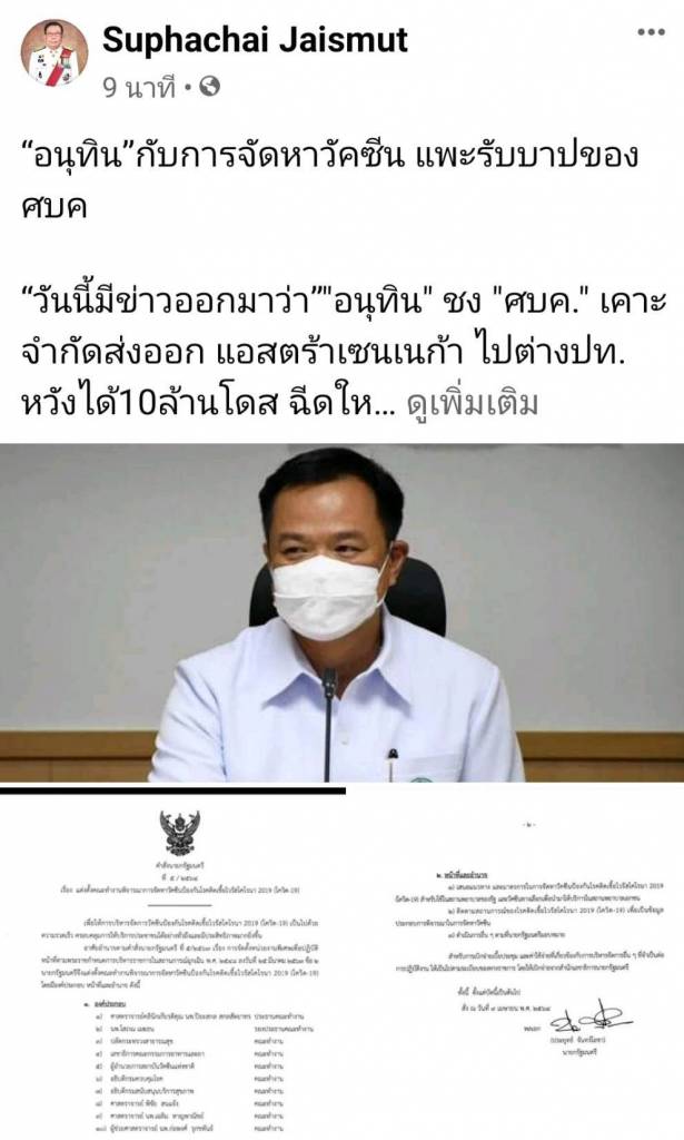 นายศุภชัย ใจสมุทร นายทะเบียนพรรค ภูมิใจไทย ออกมาโพสต์ Facebook ส่วนตัวระบุ ถึงเรื่องความรับผิดชอบในการจัดหา วัคซีน ของประเทศไทย โดยยืนยัน คำสั่งแต่งตั้ง คณะทำงานวัคซีน ของพลเอกประยุทธ์ จันทร์โอชา นายกรัฐมนตรี ที่ไม่มี ชื่อของนายอนุทิน ชาญวีรกูล รองนายกมนตรี และรัฐมนตรีว่าการกระทรวงสาธารณสุข โดยมีชื่อเรื่องว่า “อนุทิน” กับการจัดหาวัคซีน แพะรับบาปของ ศบค