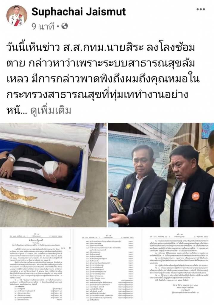 นายศุภชัย ใจสมุทร นายทะเบียนพรรคภูมิใจไทย ได้โพสต์เฟซบุ๊กส่วนตัว ในเรื่องที่ นายสิระ เจนจาคะ ส.ส. กทม. พรรคพลังประชารัฐ ได้เข้าไปนอนในโลงศพ และเรียกร้องให้ปลด นพ.โอภาส การย์กวินพงศ์ อธิบดีกรมควบคุมโรค ออกจากตำแหน่ง เพราะคุมโรคโควิด-19 ในพื้นที่ กทม.ไม่ได้ โดยนำเอกสารคำสั่งนายกรัฐมนตรีที่ 6/2564 เรื่องจัดตั้งศูนย์บูรณาการแก้ไขสถานการณ์โควิด-19 ในพื้นที่กรุงเทพมหานครและปริมณฑล ลงประกาศในราชกิจจานุเบกษา ลงวันที่ 5 พฤษภาคม 2564 และนายสิระ นอนในโลงศพ มาเป็นภาพประกอบ โดยมีเนื้อหาระบุว่า