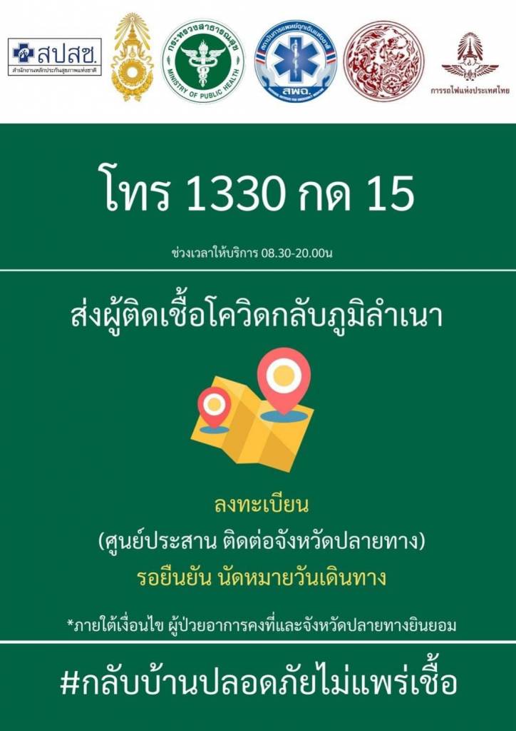 สำหรับหมายเลขโทรศัพท์ ในการประสานส่งผู้ป่วยโควิด 19 กลับไปรักษาตัวที่ภูมิลำเนา มีดังนี้ ฮอตไลน์ สปสช. โทร 1330 กด 15