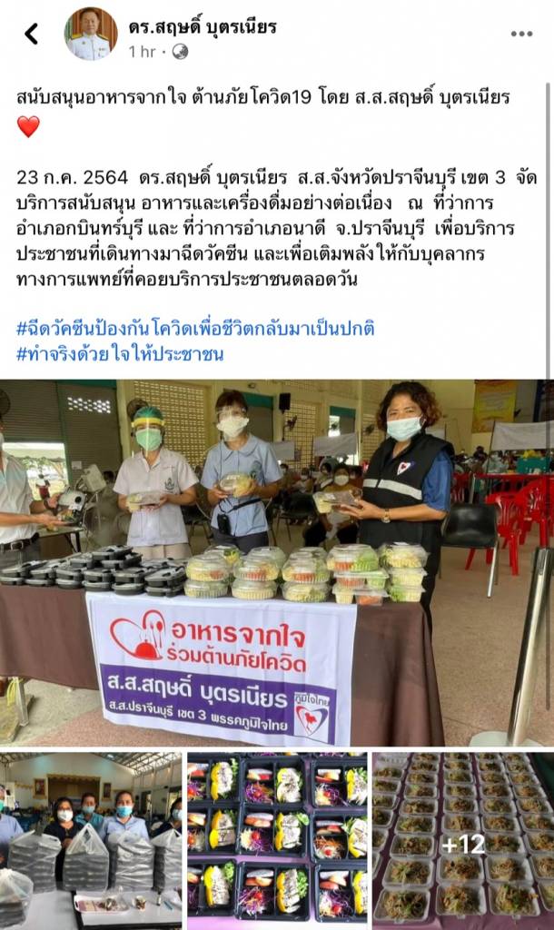 วันที่ 23 กรกฎาคม 2564 ดร.สฤษดิ์ บุตรเนียร ส.ส.จังหวัดปราจีนบุรี เขต 3 พรรคภูมิใจไทย จัดบริการสนับสนุน อาหาร และเครื่องดื่มอย่างต่อเนื่อง ณ ที่ว่าการอำเภอกบินทร์บุรี และ ที่ว่าการอำเภอนาดี จ.ปราจีนบุรี เพื่อบริการประชาชนที่เดินทางมาฉีดวัคซีน และเพื่อเติมพลังให้กับบุคลากรทางการแพทย์ที่คอยบริการประชาชนตลอดวัน