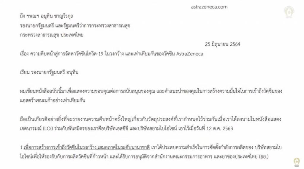 "ผมก็เลยบอกว่าโน้ตไว้แบบนี้ไม่ได้ เพราะวันที่ 7 กันยายน 2563 ที่พบกัน นั่นคือการพบกันครั้งแรก ระหว่างผมกับผู้บริหารแอสตร้าเซนเนก้า วันที่เจอกันวันที่ 7 กันยายน 2563 ไม่ใช่เป็นการเจรจาใดๆ ทั้งสิ้น คือแค่จับมือทำความรู้จักกัน และยังไม่รู้ว่าจะมีการทำสัญญาใดๆหรือเปล่า ผมก็ไม่เข้าใจว่าทำไมเขาเขียนมาตรงนี้ เพราะว่าสำหรับผม ถ้าในจดหมายที่ผมตอบไป ตรงนี้ไม่ใช่สาระของผม สาระของผมที่ตอบกลับเขาไป มีประโยคหนึ่งคือ เขาบอกว่า เขาคิดว่าจะจัดส่งให้ประเทศไทย 5-6 ล้านโดสต่อเดือน ผมตอบไปว่าประเทศไทยต้องการ 10 ล้านโดสต่อเดือน นั่นคือสาระที่ผมตอบจดหมายฉบับนี้ไป ฉะนั้นตรง 3 ล้านโดส ผมไม่ได้อ่านเลย เพราะว่ามันไม่ได้เป็นสิ่งที่เป็นส่วนหนึ่งของสัญญา หรือส่วนหนึ่งของการเจรจาใดๆ ทั้งสิ้น ไม่มีความหมาย เขียนอะไรก็ได้" นายอนุทิน กล่าว