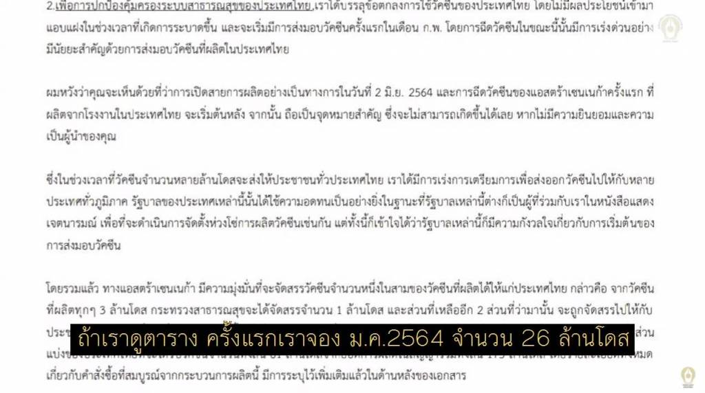 "ในเรื่องของตารางที่เห็นนี้ ก็อยากจะแก้ไขนิดหนึ่งว่า อย่างที่เขาบอกว่าเดือนมกราคม 2564 หรือ พฤษภาคม 2564 อันนี้เป็นวันที่เขาบันทึกลงไปในสารบบของเขา แต่จริง ๆแล้ว การคอนเฟิร์ม รัฐบาลไทยได้ลงนามไป ถ้าคุณประสงค์ จำได้ ตั้งแต่วันที่ 27 พฤศจิกายน 2563 ปีที่แล้ว มีการลงนามที่ทำเนียบรัฐบาล มีท่านนายกรัฐมนตรีเป็นประธาน แล้วด้านหลังมีประธานของแอสตร้าเซนเนก้าจากอังกฤษร่วมลงนาม เพราะว่ามันเป็นออนไลน์ แต่ในงานเอกสารคือส่งกลับไป กว่าเขาจะส่งกลับมาใช้เวลาอีก 2 เดือนกว่า อันนี้ก็เป็นระบบของเขาไม่เกี่ยวกับเรา แต่ว่าสำหรับเราออเดอร์คอนเฟิร์ม เรียบร้อยแล้ว ส่วนเอกสารที่ 2 อีก 35 ล้านโดส ที่มาเดือนพฤษภาคม 2564 เอกสารเราส่งไปตั้งแต่เดือนมีนาคม เช่นเดียวกันครับ ใช้เวลาในกระบวนการของเขา 2 เดือน ถึงจะส่งเอกสารกลับมาที่เรา ตรงนี้คือถ้าถามว่าแอสตร้าเซนเนก้า เขาบันทึกแบบนี้ ถ้าผมเป็นคนทำตารางแบบนี้ กระทรวงสาธารณสุขทำตารางแบบนี้ เราก็บอกว่า เราสั่งตั้งแต่ พฤศจิกายน 2563 และเดือนมีนาคม 2564"
