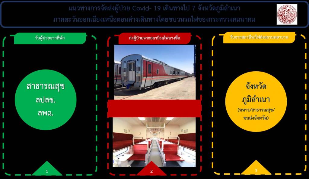 3) ผู้ว่าราชการจังหวัดภูมิลำเนา และหน่วยบริการสาธารณสุข หน่วยทหาร และขนส่งจังหวัด ร่วมในการรับ – ส่ง ผู้ป่วยจากสถานีรถไฟจังหวัดปลายทาง ไปยังสถานพยาบาลที่จังหวัด
