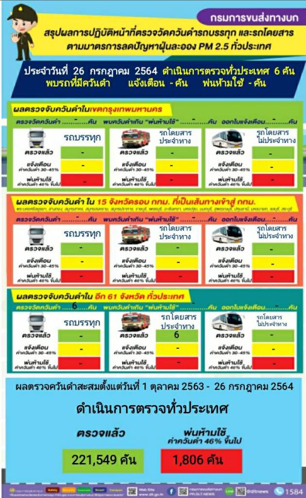 วันนี้ (26 กรกฎาคม 2564) นายจิรุตม์ วิศาลจิตร อธิบดีกรมการขนส่งทางบก เผยผลการดำเนินการตรวจควันดำรถบรรทุกและรถโดยสารทั่วประเทศ ซึ่งเป็นการดำเนินการต่อเนื่อง ตามนโยบายของนายศักดิ์สยาม ชิดชอบ รัฐมนตรีว่าการกระทรวงคมนาคม เพื่อป้องกันและแก้ไขปัญหาฝุ่นละอองขนาดเล็ก PM2.5 เฉพาะวันที่ 26 กรกฎาคม 2564 ดำเนินการตรวจวัดควันดำรถโดยสารและรถบรรทุกทั่วประเทศ จำนวน 6 คัน ไม่พบรถที่มีค่าควันดำเกินเกณฑ์มาตรฐานที่ราชการกำหนด ส่งผลให้ตั้งแต่วันที่ 1 ตุลาคม – 26 กรกฎาคม 2564 ดำเนินการตรวจควันดำรถทั้งสิ้น 221,549 คัน พ่นห้ามใช้แล้วจำนวน 1,806 คัน ทั้งนี้ กำชับผู้ประกอบการและเจ้าของรถทุกคันที่ถูกพ่นห้ามใช้ ต้องนำรถไปแก้ไขและนำรถเข้ารับการตรวจสภาพ ณ สำนักงานขนส่ง หากฝ่าฝืนใช้รถโดยที่มีคำสั่งห้ามใช้ มีความผิดตามกฎหมาย ด้านประชาชนสามารถมีส่วนร่วมป้องกันและแก้ไขปัญหาฝุ่นละอองขนาดเล็ก PM2.5 ด้วยการส่งภาพรถบรรทุกและรถโดยสารควันดำที่สังเกตเห็นหมายเลขทะเบียนชัดเจน ให้ศูนย์คุ้มครองผู้โดยสารและรับเรื่องร้องเรียน สายด่วน 1584 ตลอด 24 ชั่วโมง •Line@: @1584DLT •Facebook: 1584 ร้องเรียนรถโดยสารสาธารณะ https://www.facebook.com/dlt1584/ •เว็บไซต์ http://ins.dlt.go.th/cmpweb/ •แอปพลิเคชัน DLT GPS •E-mail: dlt_1584complain@hotmail.com
