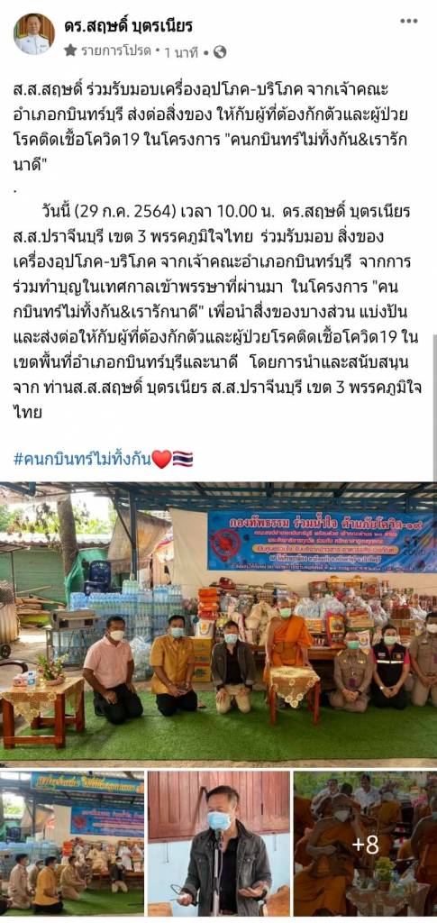 วันนี้ (29 ก.ค. 2564) เวลา 10.00 น. ดร.สฤษดิ์ บุตรเนียร ส.ส.ปราจีนบุรี เขต 3 พรรคภูมิใจไทย ร่วมรับมอบ สิ่งของเครื่องอุปโภค-บริโภค จากเจ้าคณะอำเภอกบินทร์บุรี จากการร่วมทำบุญในเทศกาลเข้าพรรษาที่ผ่านมา ในโครงการ "คนกบินทร์ไม่ทิ้งกัน&เรารักนาดี" เพื่อนำสื่งของบางส่วน แบ่งปันและส่งต่อให้กับผู้ที่ต้องกักตัว และผู้ป่วยโรคติดเชื้อโควิด-19 ในเขตพื้นที่อำเภอกบินทร์บุรี และนาดี