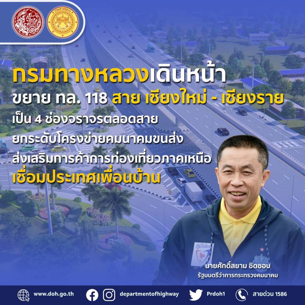 กรมทางหลวง ขานรับนโยบาย รมว.คมนาคม เดินหน้าขยายสาย 118 เชียงใหม่-เชียงราย เป็น 4 ช่องจราจรตลอดสาย ยกระดับโครงข่ายคมนาคมขนส่ง ส่งเสริมการค้าและการท่องเที่ยวภาคเหนือเชื่อมประเทศเพื่อนบ้าน