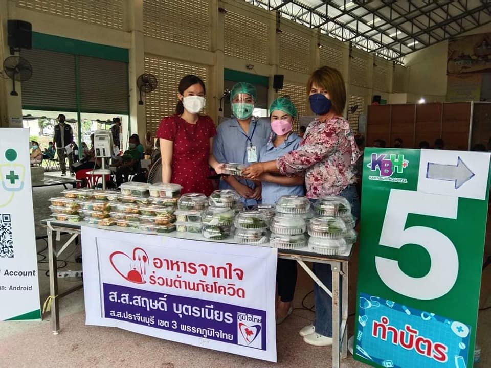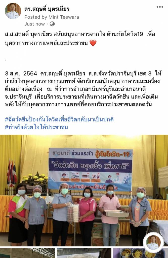 ต่อจากนั้น ส.ส.สฤษดิ์ ได้เดินทางไปให้กำลังใจบุคลากรทางการแพทย์ จัดบริการสนับสนุน อาหาร และเครื่องดื่มอย่างต่อเนื่อง ณ ที่ว่าการอำเภอกบินทร์บุรี และอำเภอนาดี จ.ปราจีนบุรี เพื่อบริการประชาชนที่เดินทางมาฉีดวัคซีน และเพื่อเติมพลังให้กับบุคลากรทางการแพทย์ที่คอยบริการประชาชนตลอดวัน