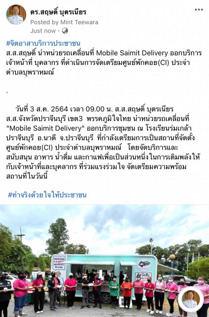 วันที่ 3 ส.ค. 2564 เวลา 09.00 น. ส.ส.สฤษดิ์ บุตรเนียร ส.ส.จังหวัดปราจีนบุรี เขต3 พรรคภูมิใจไทย นำหน่วยรถเคลื่อนที่ "Mobile Saimit Delivery" ออกบริการชุมชน ณ โรงเรียนร่มเกล้าปราจีนบุรี อ.นาดี จ.ปราจีนบุรี ที่กำลังเตรียมการเป็นสถานที่จัดตั้ง ศูนย์พักคอย(CI) ประจำตำบลบุพราหมณ์ โดยจัดบริการและสนับสนุน อาหาร น้ำดื่ม และกาแฟเพื่อเป็นส่วนหนึ่งในการเติมพลังให้กับเจ้าหน้าที่และบุคลากร ที่ร่วมแรงร่วมใจ จัดเตรียมความพร้อมสถานที่ในวันนี้