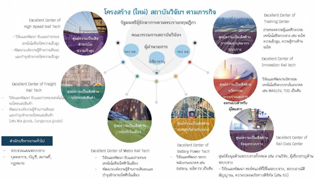 1.5 ศูนย์ความเป็นเลิศด้านนวัตกรรมระบบรางและการออกแบบสำหรับผู้โดยสาร (Excellent Center of Innovation Rail Tech) ทำหน้าที่เกี่ยวกับการวิจัยและพัฒนานวัตกรรมเทคโนโลยีระบบรางในอนาคต เช่น MAGLEV TOD เป็นต้น