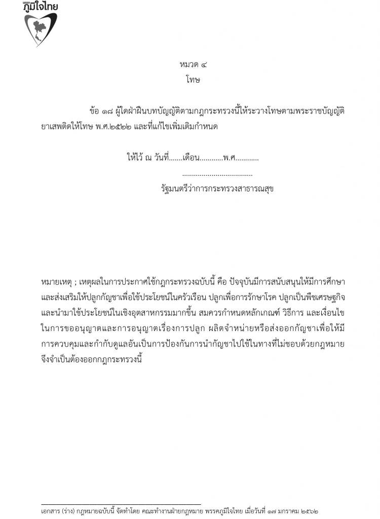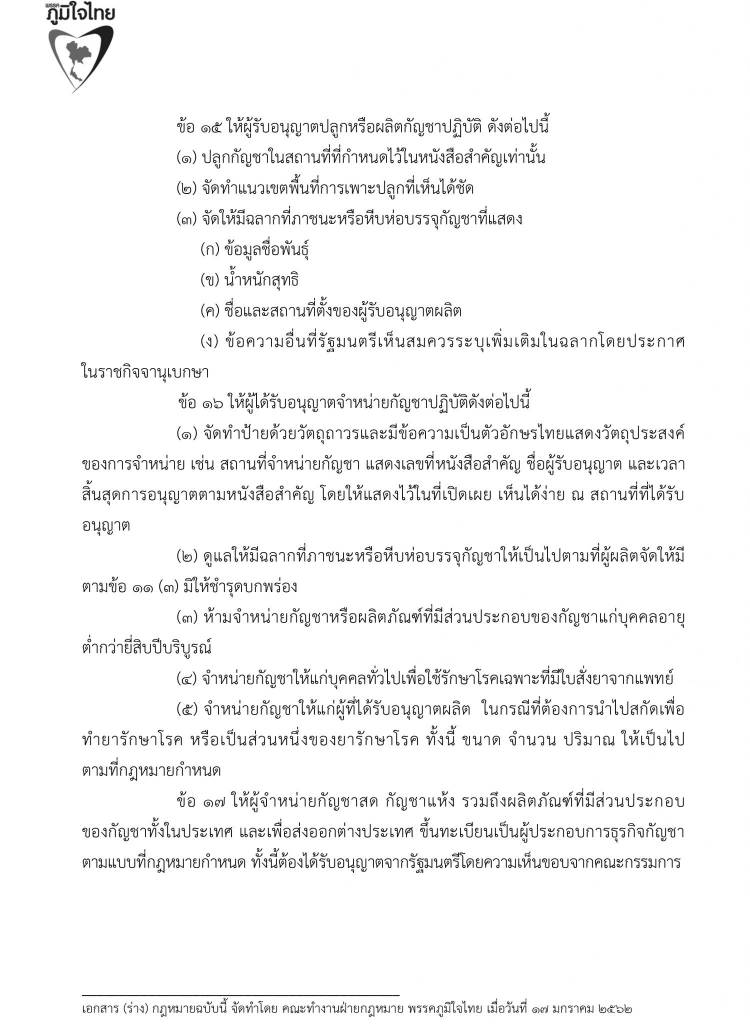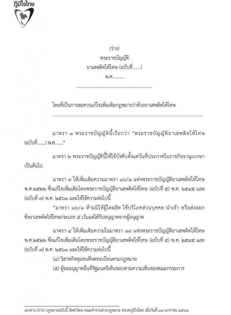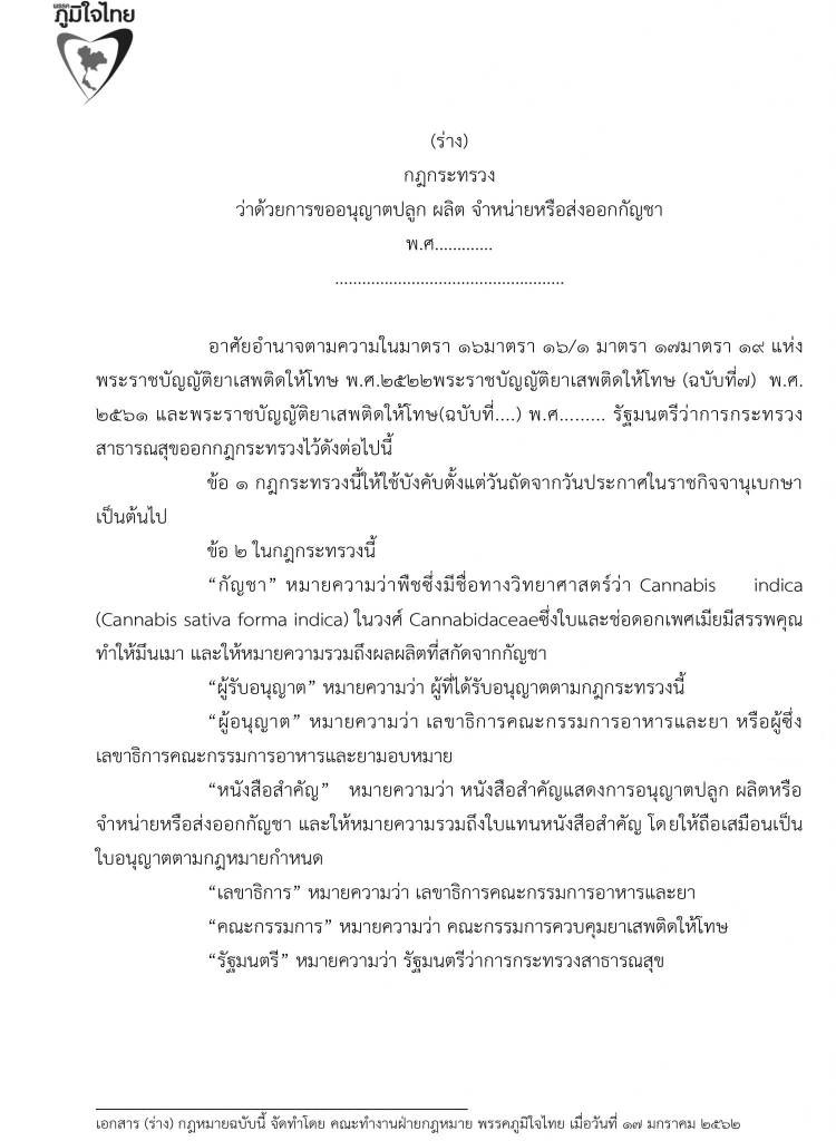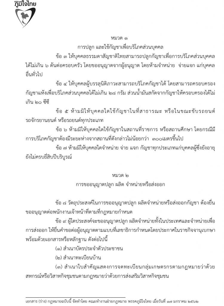 17 มกราคม 2562 เวลา 21:07ร่วมลงชื่อ … เสนอร่างพระราชบัญญัติยาเสพติดให้โทษ (กัญชา)พรรคภูมิใจไทย ทลายทุกข้อจำกัด ลดอำนาจรัฐ เพื่อปากท้องประชาชน กัญชาไทย ปลูกได้เสรี ด้วยรูปแบบ แคลิฟอร์เนียโมเดล ให้ขึ้นทะเบียน มีค่าธรรมเนียมการปลูกกัญชา ต้นละ 30 บาท ปลูกได้ครอบครัวละ 6 ต้น เพื่อใช้เป็นยารักษาโรค สันทนาการในบ้าน และ เพิ่มมูลค่าสินค้าต่าง ๆ กัญชาไทย จะเป็นพืชเศรษฐกิจตัวใหม่ที่นำความร่ำรวยมาสู่พี่น้องเกษตรกรชาวไทย แชร์บทความนี้: