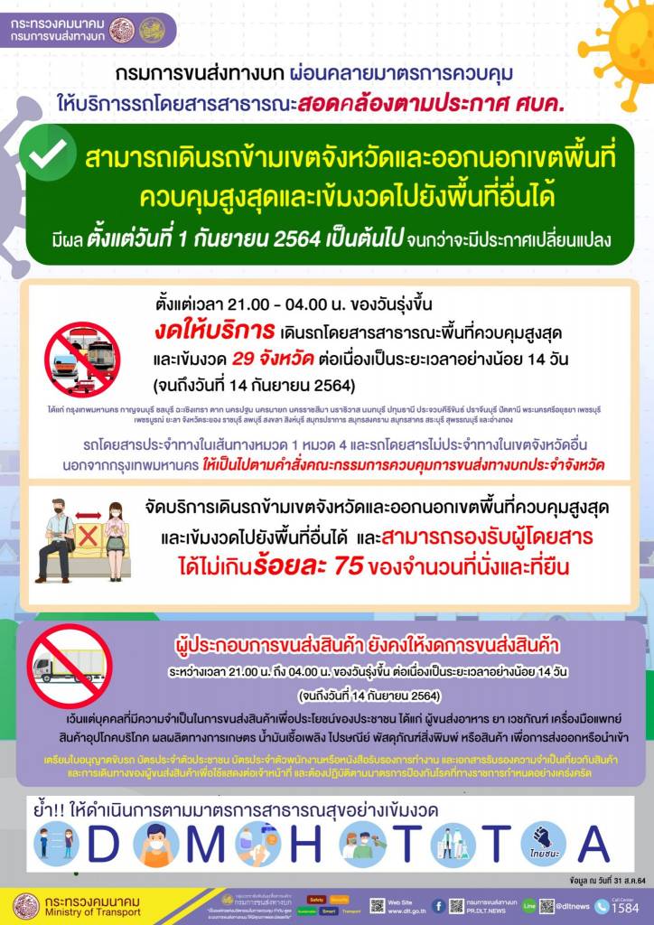 ข้ามเขตจังหวัดและออกนอกเขตพื้นที่ควบคุมสูงสุดและเข้มงวดไปยังพื้นที่อื่นได้ และสามารถรองรับผู้โดยสารได้ไม่เกินร้อยละ 75 ของจำนวนที่นั่งและที่ยืน ทั้งนี้ สำหรับการให้บริการรถโดยสารประจำทางในพื้นที่กรุงเทพมหานคร และเส้นทางระหว่างจังหวัดที่มีต้นทางหรือปลายทางกรุงเทพมหานคร (หมวด 1 ในเขตกรุงเทพมหานคร และจังหวัดที่มีเส้นทางต่อเนื่อง หมวด 4 กรุงเทพมหานคร หมวด 2 หมวด 3) และรถโดยสารไม่ประจำทางที่มีท้องที่ทำการขนส่งทั่วราชอาณาจักร ยังคงงดให้บริการตั้งแต่เวลา 21.00 - 04.00 น. ของวันรุ่งขึ้น ต่อเนื่องเป็นระยะเวลาอย่างน้อย 14 วัน (จนถึงวันที่ 14 กันยายน 2564) ส่วนการให้บริการของรถโดยสารประจำทางในเส้นทางหมวด 1 หมวด 4 และรถโดยสารไม่ประจำทาง ในเขตจังหวัดอื่นนอกจากกรุงเทพมหานคร ให้เป็นไปตามคำสั่งคณะกรรมการควบคุมการขนส่งทางบกประจำจังหวัด โดยการให้บริการเดินทางด้วยรถโดยสารสาธารณะทุกประเภทยังต้องดำเนินการตามมาตรการสาธารณสุขเพื่อควบคุมการแพร่กระจายของโรคอย่างเคร่งครัด อาทิ ต้องมีมาตรการคัดกรองผู้โดยสาร ปฏิบัติตามมาตรการเว้นระยะห่าง สวมใส่หน้ากากอนามัยหรือหน้ากากผ้าตลอดการเดินทาง จัดเก็บข้อมูลของผู้โดยสารเพื่อประโยชน์ในการติดตามสอบถาม เป็นต้น