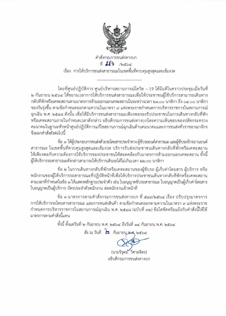 กรมการขนส่งทางบก เผย!!! ศปก.ศบค. ขยายระยะเวลาให้ผู้ประกอบการขนส่งด้วยรถโดยสารสาธารณะ ในเขตพื้นที่ควบคุมสูงสุดและเข้มงวด สามารถให้บริการเดินรถได้ไม่เกินเวลา 22.00 นาฬิกา เพื่ออำนวยความสะดวกในการเดินทางของประชาชน