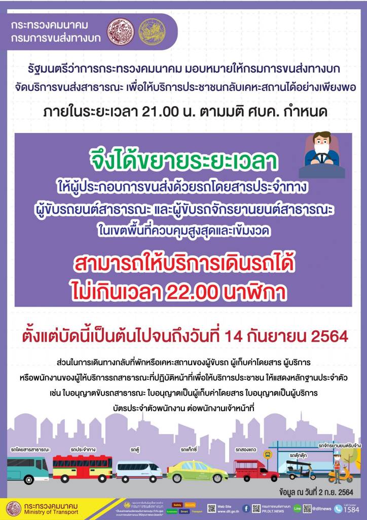 กรมการขนส่งทางบก เผย!!! ศปก.ศบค. ขยายระยะเวลาใหผู้ประกอบการขนส่งด้วยรถโดยสารสาธารณะ ในเขตพื้นที่ควบคุมสูงสุดและเข้มงวด สามารถให้บริการเดินรถได้ไม่เกินเวลา 22.00 น.เพื่ออำนวยความสะดวกในการเดินทางของประชาชน