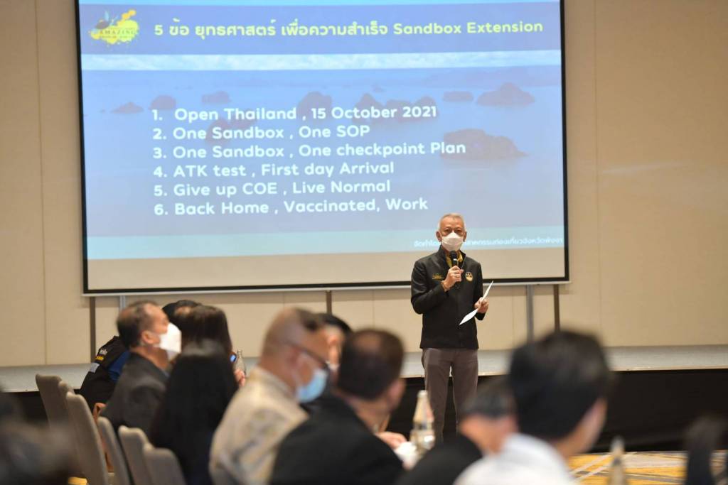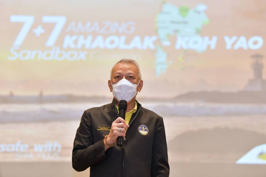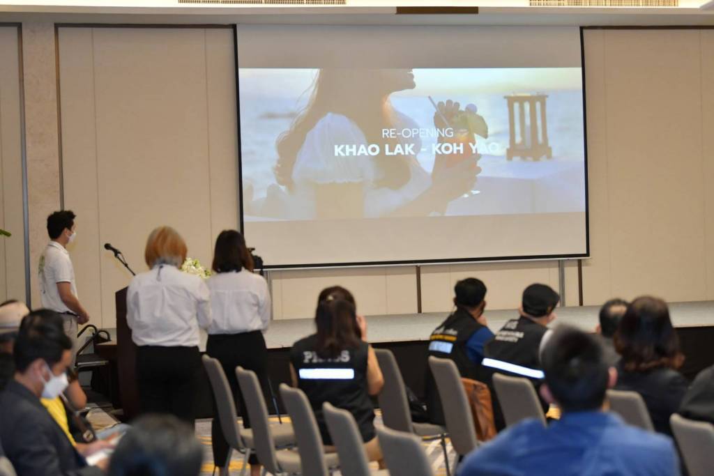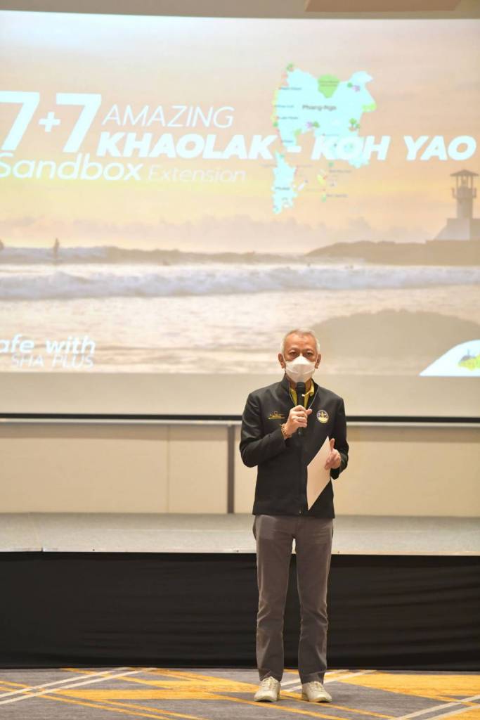 นายพงศกร เกตุประภากร ประธานสภาอุตสาหกรรมการท่องเที่ยวจังหวัดพังงา กล่าวว่า จังหวัดพังงาเปิดรับนักท่องเที่ยวที่พำนักในจังหวัดภูเก็ตแล้ว 7 คืน ตั้งแต่วันที่ 16 สิงหาคม 2564 ความคืบหน้าการฉีดวัคซีนในพื้นที่จังหวัดพังงา ร้อยละ 52.66 การจัดทำเส้นทางเชื่อมโยงพื้นที่นำร่อง 4 จังหวัด จัดทำคู่มือมาตรฐานการปฏิบัติงาน และ Timeline การเดินทางของนักท่องเที่ยวทั้งชาวไทยและชาวต่างชาติ โดยนักท่องเที่ยวเข้าพักโรงแรมที่อยู่ในพื้นที่นำร่องเขาหลักแซนด์บ็อกซ์ ที่ผ่านมาตรฐาน SHA และ SHA+ ซึ่งขณะนี้ที่จังหวัดพังงา มีสถานประกอบการ 10 ประเภทที่ผ่านมาตรฐาน SHA จำนวน 554 ราย และ SHA+ จำนวน 222 ราย และตลอดการเข้าพักต้องแชร์ตำแหน่งที่อยู่ปัจจุบันผ่าน Application หมอชนะ อย่างน้อยวันละ 1 ครั้ง นอกจากนี้ต้องมีการตรวจหาเชื้อโควิด -19 หากทราบผลว่าติดเชื้อโควิด -19 ต้องเข้าทำการรักษาในโรงพยาบาลที่รัฐกำหนดทันที ในส่วนของแผนการตลาดและการประชาสัมพันธ์ พังงานอกจากมีสถานที่ท่องเที่ยวที่สวยงามแบบธรรมชาติแล้ว ยังมีกีฬาที่น่าสนใจ เช่น เซิฟบอร์ด เซิฟสเก็ต กีฬาดำน้ำ กีฬาโยคะ หรือจะเป็นอาหารที่สด สะอาด อร่อย มีผลไม้ที่เป็นเอกลักษณ์ของพังงา ฯลฯ