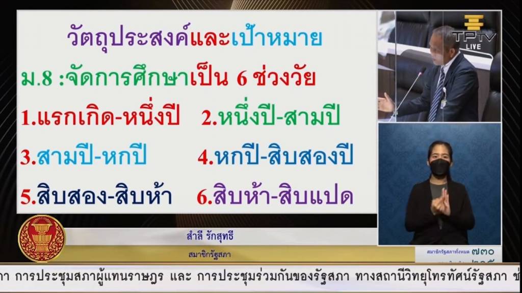 วัตถุประสงค์และเป้าหมาย สิ่งที่ครูเขาต้องการมากที่สุดคือมาตรา 8 คือการจัดการศึกษาเป็น 7 ช่วงวัย ถือว่าเป็นการละเลยหรือก้าวข้ามช่วงวัยเด็ก 1 ไป นั่นก็คือ ช่วงวัยแรกเกิดเราควรจะโยนลงมาให้ตั้งแต่อยู่ในครรภ์จนถึงแรกเกิด เหตุผลคือ ตามหลักแล้วเขาบอกว่าเด็กจะเรียนรู้ตั้งแต่ 4 เดือนเป็นต้นไป เด็กสามารถอ่านออก ไม่ใช่อ่านได้ คำว่าอ่านออก คือ เราสามารถให้เด็กเรียนในครรภ์ได้ตั้งแต่ 4 เดือน อันนี้ มีผู้เขียน ให้เหตุผลไว้ว่าเราให้ถึงอนุบาลก็สายเสียแล้ว ในประเทศต่างๆ เขาเริ่มตั้งแต่แรกเกิดมาหลายปีแล้วซึ่งปัจจุบันเขาเริ่มกันตั้งแต่ในครรภ์แล้ว ถ้าเป็นไปได้ แต่นั่นคงเป็นไปได้ยากเพราะรัฐธรรมนูญได้ล็อกไว้แล้ว ว่าจะดูแลเด็กตั้งแต่แรกเกิด เพราะฉะนั้นถ้าจะพัฒนาประเทศไทย ให้เป็นที่ 1 ในโลก จะต้องเริ่มตั้งแต่ 4 เดือน ดังนั้นจึงขอฝากไปยัง ผู้มีส่วนเกี่ยวข้องของด้านการศึกษา ทำดูแลเด็กตั้งแต่ในครรภ์
