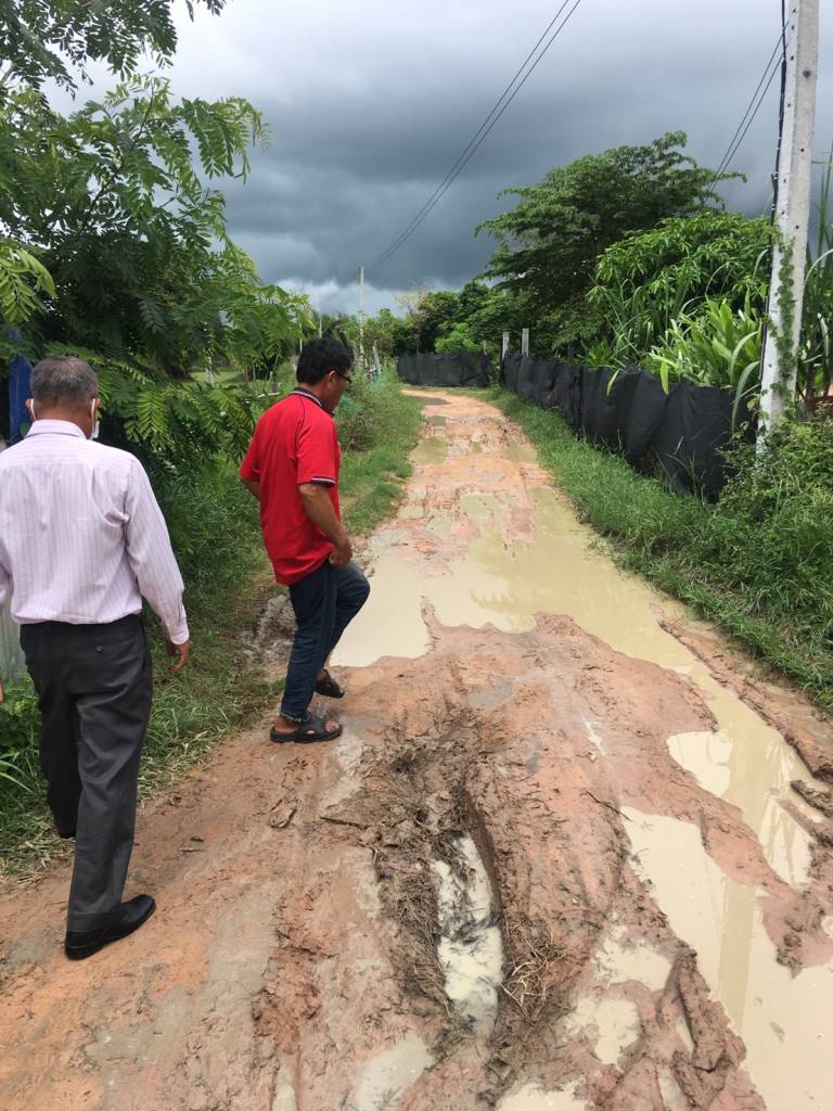 ต่อจากนั้น ลงพื้นที่บ้านเอียด ต.เขวา อ.เมือง มหาสารคาม รับเรื่องร้องเรียนชาวบ้านเรื่องถนนเข้าหมู่บ้านชำรุด เป็นหลุมเสียหาย
