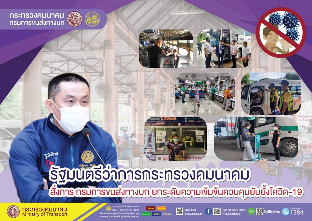 นายจิรุตม์ วิศาลจิตร อธิบดีกรมการขนส่งทางบก เปิดเผยว่า จากสถานการณ์การแพร่ระบาดโรคติดเชื้อไวรัสโคโรนา 2019 (COVID-19) ในปัจจุบัน นายศักดิ์สยาม ชิดชอบ รัฐมนตรีว่าการกระทรวงคมนาคม กำชับให้หน่วยงานในสังกัดกระทรวงคมนาคม ดำเนินการตามมาตรการป้องกันการแพร่ระบาดของโรคโควิด-19 ในระบบขนส่งสาธารณะอย่างเคร่งครัด รองรับผู้โดยสารได้ไม่เกินร้อยละ 75 ของจำนวนที่นั่งและที่ยืน ขยายระยะเวลาให้ผู้ให้บริการโดยสารสาธารณะ ในพื้นที่ควบคุมสูงสุดและเข้มงวด