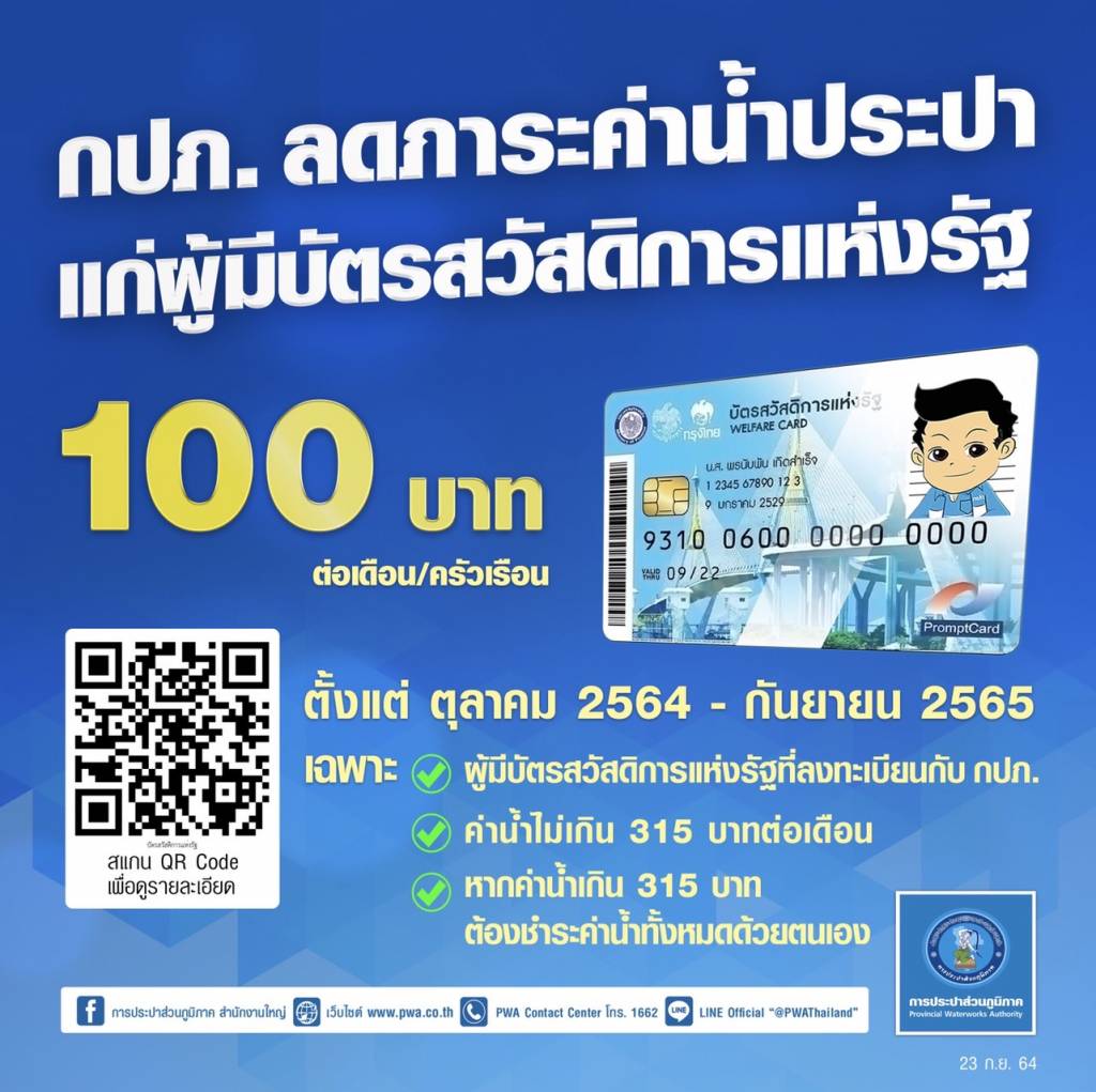 นายสมบูรณ์ สุนันทพงศ์ศักดิ์ ผู้ว่าการ กปภ. กล่าวเพิ่มเติมว่า สำหรับผู้มีบัตรสวัสดิการแห่งรัฐที่เคยลงทะเบียนกับ กปภ. แล้ว สามารถใช้สิทธิ์ได้ทันทีโดยไม่ต้องลงทะเบียนซ้ำอีก ทั้งนี้ สำหรับผู้มีบัตรสวัสดิการแห่งรัฐที่ยังไม่เคยลงทะเบียน สามารถลงทะเบียนผ่านเว็บไซต์ กปภ. ได้ที่ https://payment.pwa.co.th/welfare-register/ หรือที่ กปภ. ทั้ง 234 สาขาทั่วประเทศ พร้อมทั้งแสดงบัตรฯ ได้ตั้งแต่บัดนี้เป็นต้นไป ซึ่งใช้สิทธิ์ได้ตั้งแต่เดือนตุลาคม 2564 - เดือนกันยายน 2565 (ใบแจ้งค่าน้ำประปาเดือนพฤศจิกายน 2564 - เดือนตุลาคม 2565) รวมเป็นระยะเวลา 12 เดือน โดยเริ่มใช้สิทธิ์ได้ตั้งแต่ลงทะเบียน สำหรับผู้มีบัตรฯ ที่ลงทะเบียนแล้ว สามารถชำระค่าน้ำประปาได้ที่สำนักงาน กปภ.สาขา และตัวแทนรับชำระค่าน้ำประปาของ กปภ. ทั่วประเทศ รวมถึงช่องทางการชำระค่าน้ำประปาในระบบออนไลน์ได้ตามปกติ หลังจากนั้น กรมบัญชีกลางจะนำเงินจากกองทุนประชารัฐเพื่อเศรษฐกิจฐานรากและสังคม (กองทุนประชารัฐฯ) มาจ่ายคืนผ่านบัตรสวัสดิการแห่งรัฐเข้ากระเป๋าเงินอิเล็กทรอนิกส์ (e-Money) ให้แก่ผู้มีบัตรฯต่อไป อย่างไรก็ตาม สอบถามข้อมูลเพิ่มเติมได้ที่ PWA Contact Center โทร. 1662 หรือ สำนักนโยบายภาษี สำนักงานเศรษฐกิจการคลัง โทร. 0-2273-9020 ต่อ 3512#ก้าวไปด้วยกัน#ไม่ทิ้งใครไว้ข้างหลัง#การประปาส่วนภูมิภาค