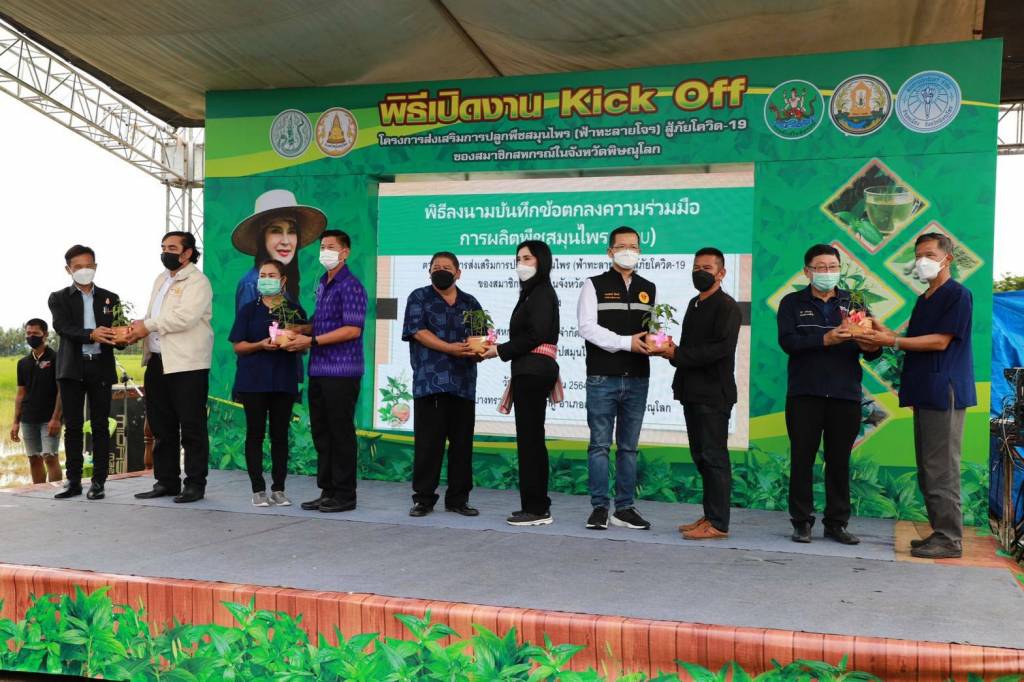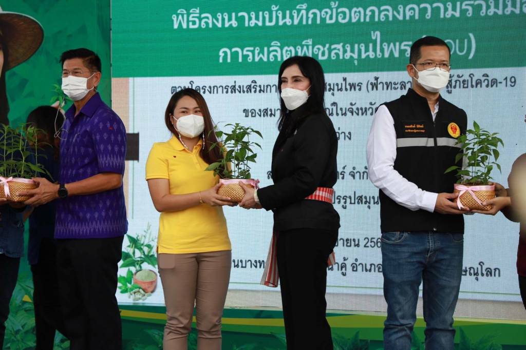 โอกาสนี้ รมช.มนัญญา ได้มอบกล้าพันธุ์ฟ้าทะลายโจรให้กับผู้แทนสหกรณ์ที่เข้าร่วมโครงการ และผู้แทนประชาชนที่ลงทะเบียนจองผ่านเว็บไซต์กรมวิชาการเกษตร ซึ่ง จ.พิษณุโลกมีผู้ลงทะเบียนจำนวนทั้งสิ้น 423 ราย และร่วมเป็นสักขีพยานในการลงนามบันทึกข้อตกลงความร่วมมือรับซื้อฟ้าทะลายโจร ระหว่าง สหกรณ์วัดจันทร์ จำกัด และสหกรณ์นิคมพันชาลี จำกัด กับกลุ่มวิสาหกิจชุมชนปลูกและแปรรูปสมุนไพรทับยายเชียง จากนั้นร่วมปลูกฟ้าทะลายโจรร่วมกับผู้บริหาร หัวหน้าส่วนราชการ ตลอดจนเยี่ยมชมนิทรรศการการผลิตสมุนไพรฟ้าทะลายโจรของสำนักวิจัยและพัฒนาการเกษตรเขต 2 จังหวัดพิษณุโลก และยังได้มอบผลิตภัณฑ์ยาฟ้าทะลายโจรชนิดแคปซูลมอบให้เกษตรกรและประชาชนที่มาต้อนรับ