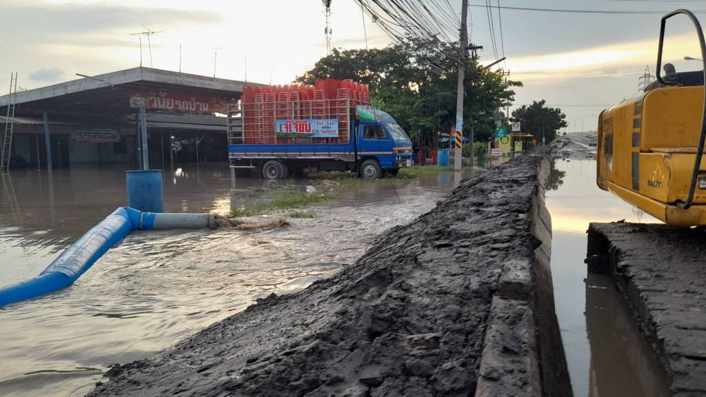 - ทล.32 อ่างทอง – ไชโย กม.57+500 (จุดกลับรถบางศาลา) ระดับน้ำสูง 40 ซม.