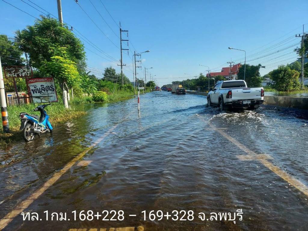 - ทล.1 แยกโรงพยาบาลอานันทมหิดล-โคกสำโรง ช่วง กม.ที่ 168+228-169+328 ระดับน้ำสูง 50 ซม. ทางเลี่ยง