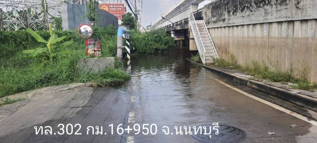 - ทล. 302 สะพานพระนั่งเกล้า-ต่างระดับบางใหญ่ ช่วง กม.ที่ 17+000 ระดับน้ำสูง 30-35 ซม. ใช้จุดกลับรถใต้สะพาน