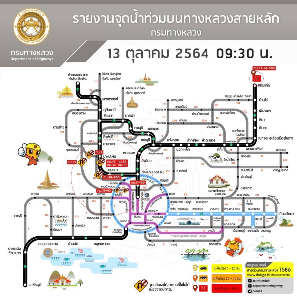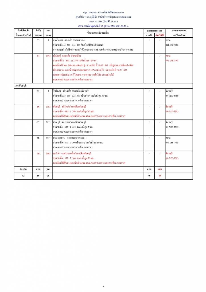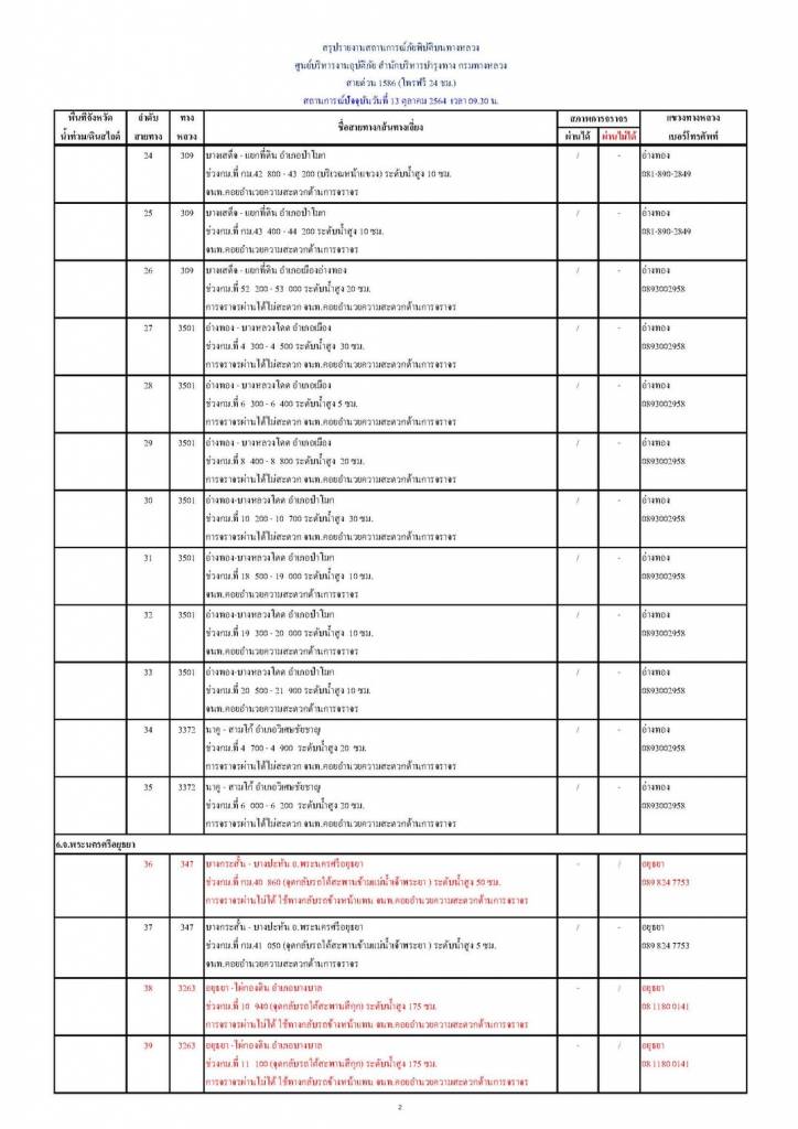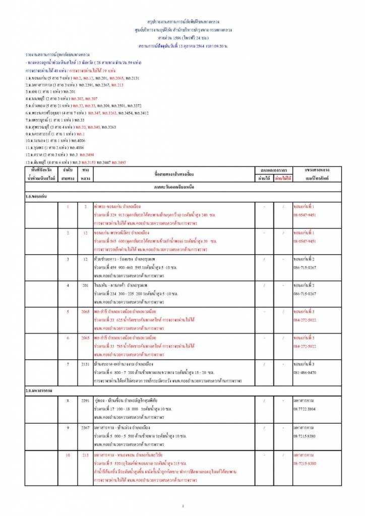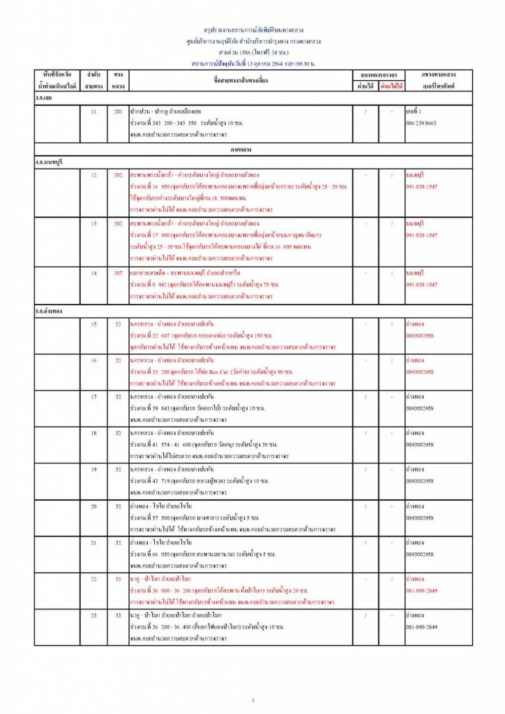 13 ตุลาคม 2564 เวลา 13:06กรมทางหลวง ขานรับนโยบาย รมว.คมนาคม รายงานสถานการณ์ น้ำท่วม และดินสไลด์ ในโครงข่ายทางหลวง วันพุธที่ 13 ตุลาคม 2564 เวลา 09.30 น.กรมทางหลวง ขานรับนโยบาย รมว.คมนาคม รายงานสถานการณ์ น้ำท่วม และดินสไลด์ ในโครงข่ายทางหลวง วันพุธที่ 13 ตุลาคม 2564 เวลา 09.30 น. ดังนี้ ตามที่ นายศักดิ์สยาม ชิดชอบ รัฐมนตรีว่าการกระทรวงคมนาคม สั่งหน่วยงานในสังกัดเร่งเฝ้าสถานการณ์น้ำท่วม/ดินสไลด์ 13 จังหวัด รวม 59 แห่ง การจราจรผ่านได้ 40 แห่ง ผ่านไม่ได้ 19 แห่ง 1.จ.ขอนแก่น ( 7 แห่ง) - การจราจรผ่านได้ 3 แห่ง - การจราจรผ่านไม่ได้ 4 แห่ง 2.จ.มหาสารคาม ( 3 แห่ง) - การจราจรผ่านได้ 2 แห่ง - การจราจรผ่านไม่ได้ 1 แห่ง 3.จ.เลย ( 1 แห่ง) - การจราจรผ่านได้ 1 แห่ง - การจราจรผ่านไม่ได้ 0 แห่ง 4.จ.นนทบุรี ( 3 แห่ง) - การจราจรผ่านได้ - แห่ง - การจราจรผ่านไม่ได้ 3 แห่ง 5.จ.อ่างทอง ( 21 แห่ง) - การจราจรผ่านได้ 18 แห่ง - การจราจรผ่านไม่ได้ 3 แห่ง 6.จ.พระนครศรีอยุธยา ( 7 แห่ง) - การจราจรผ่านได้ 4 แห่ง - การจราจรผ่านไม่ได้ 3 แห่ง 7.จ.เพชรบูรณ์ ( 1 แห่ง) - การจราจรผ่านได้ - แห่ง - การจราจรผ่านไม่ได้ 1 แห่ง 8.จ.สุพรรณบุรี ( 4 แห่ง) - การจราจรผ่านได้ 2 แห่ง - การจราจรผ่านไม่ได้ 2 แห่ง 9.จ.นครสวรรค์ ( 1 แห่ง) - การจราจรผ่านได้ 1 แห่ง - การจราจรผ่านไม่ได้ - แห่ง 10.จ.ระนอง ( 1 แห่ง) - การจราจรผ่านได้ 1 แห่ง - การจราจรผ่านไม่ได้ – แห่ง 11.จ.ชุมพร ( 2 แห่ง) - การจราจรผ่านได้ 2 แห่ง - การจราจรผ่านไม่ได้ – แห่ง 12.จ.ตราด ( 3 แห่ง) - การจราจรผ่านได้ 2 แห่ง - การจราจรผ่านไม่ได้ 1 แห่ง 13.จ.จันทบุรี ( 5 แห่ง) - การจราจรผ่านได้ 3 แห่ง - การจราจรผ่านไม่ได้ 2 แห่ง แชร์บทความนี้:
