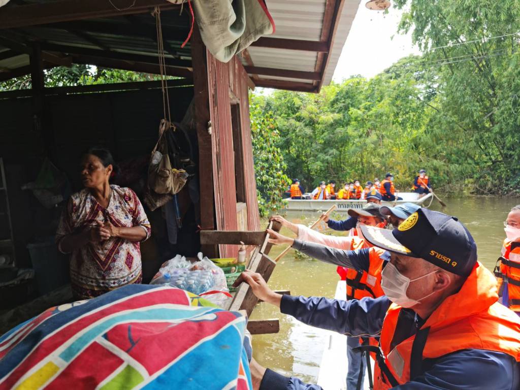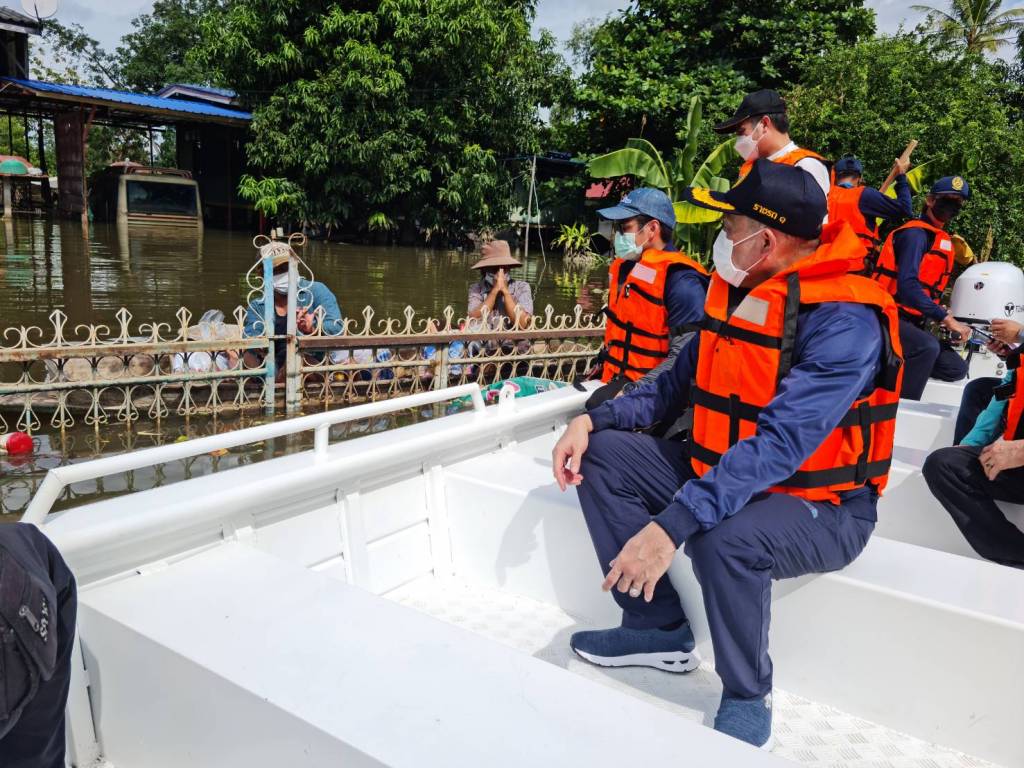 จากนั้นเดินทาง ไปยังเทศบาลตำบลไชโย อำเภอไชโย จังหวัดอ่างทองรับฟังบรรยายสรุปสถานการณ์อุทกภัยจังหวัดอ่างทอง และเยี่ยมผู้ประสบอุทกภัยที่สำนักงานเทศบาลตำบลไซโย อำเภอไชโย จังหวัดอ่างทอง ลงเรือเข้าไปมอบถุงยังชีพให้ประชาชนในพื้นที่ตำบลจรเข้ร้อง อำเภอไซโย ก่อนตรวจเส้นทางคมนาคมที่ได้รับความเสียหายจากอุทกภัย ถนนสาย อท.2034 บ้านรี - มหานาม