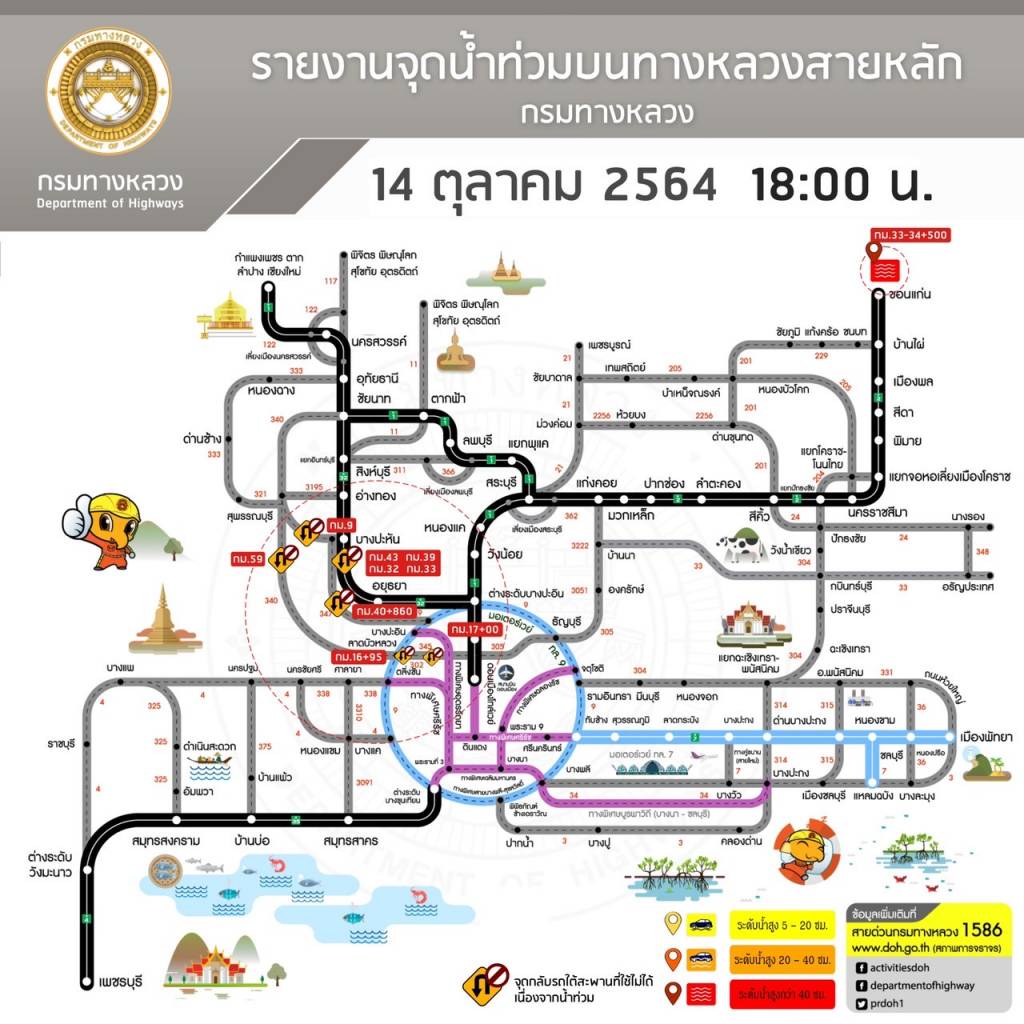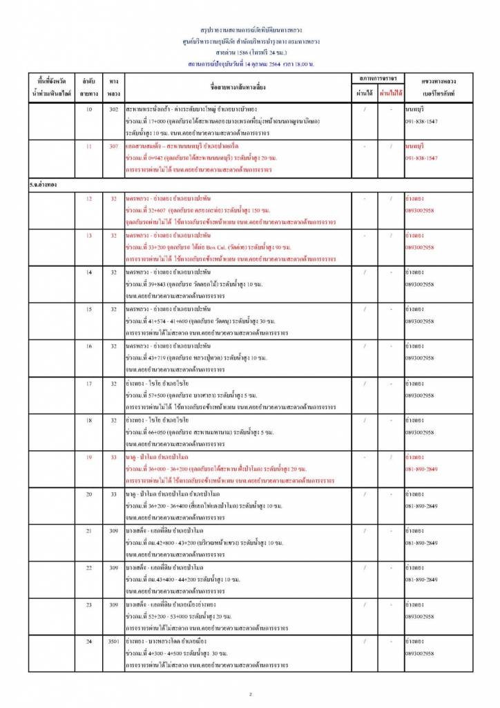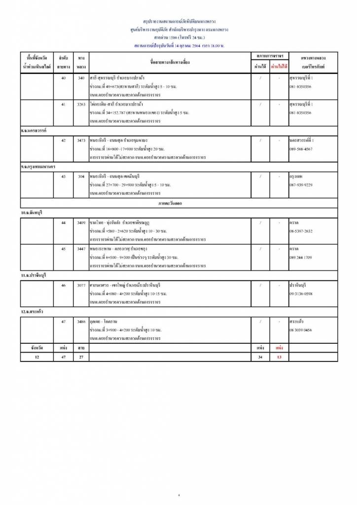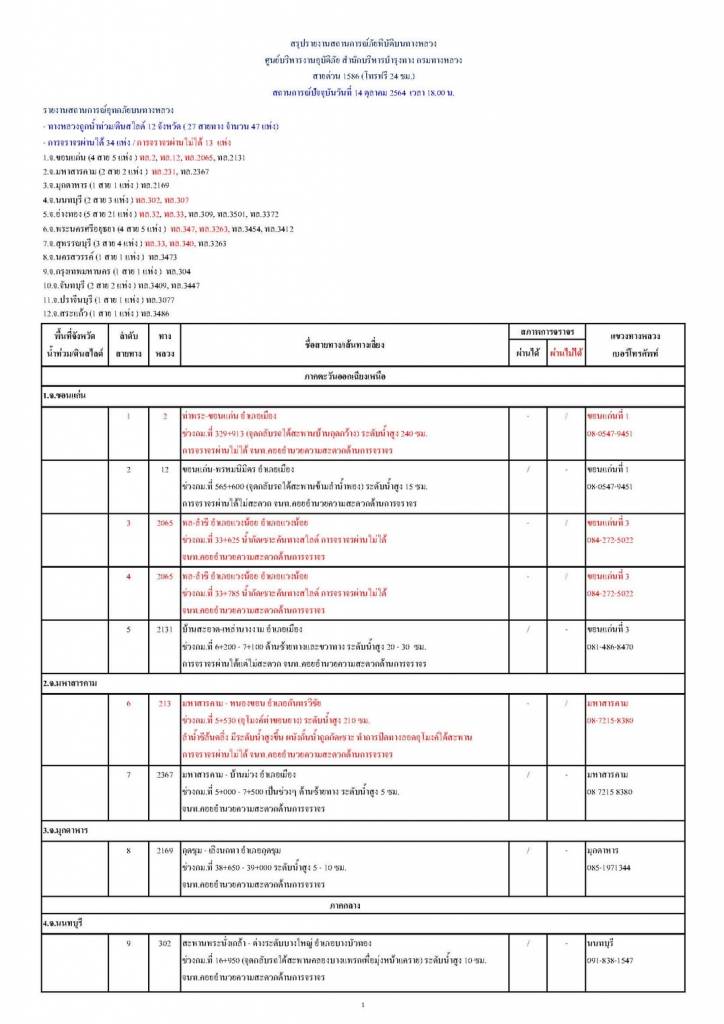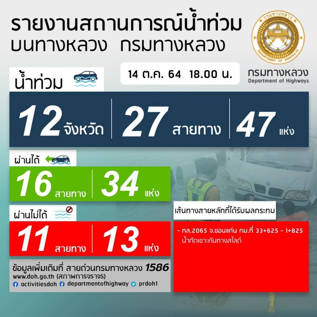 14 ตุลาคม 2564 เวลา 21:22กรมทางหลวงรายงานสถานการณ์ น้ำท่วม และดินสไลด์ ในโครงข่ายทางหลวงตามนโยบายนายศักดิ์สยาม ชิดชอบ รัฐมนตรีว่าการกระทรวงคมนาคม วันพฤหัสบดีที่ 14 ตุลาคม 2564กรมทางหลวงรายงานสถานการณ์ น้ำท่วม และดินสไลด์ ในโครงข่ายทางหลวงตามนโยบายนายศักดิ์สยาม ชิดชอบ รัฐมนตรีว่าการกระทรวงคมนาคม วันพฤหัสบดีที่ 14 ตุลาคม 2564 เวลา 18.00 น. ดังนี้ น้ำท่วม/ดินสไลด์ 12 จังหวัด รวม 47 แห่ง การจราจรผ่านได้ 34 แห่ง ผ่านไม่ได้ 13 แห่ง 1.จ.ขอนแก่น ( 5 แห่ง) - การจราจรผ่านได้ 2 แห่ง - การจราจรผ่านไม่ได้ 3 แห่ง 2.จ.มหาสารคาม ( 2 แห่ง) - การจราจรผ่านได้ 1 แห่ง - การจราจรผ่านไม่ได้ 1 แห่ง 3.จ.มุกดาหาร ( 1 แห่ง) - การจราจรผ่านได้ 1 แห่ง - การจราจรผ่านไม่ได้ - แห่ง 4.จ.นนทบุรี ( 3 แห่ง) - การจราจรผ่านได้ 2 แห่ง - การจราจรผ่านไม่ได้ 1 แห่ง 5.จ.อ่างทอง ( 21 แห่ง) - การจราจรผ่านได้ 18 แห่ง - การจราจรผ่านไม่ได้ 3 แห่ง 6.จ.พระนครศรีอยุธยา ( 5 แห่ง) - การจราจรผ่านได้ 2 แห่ง - การจราจรผ่านไม่ได้ 3 แห่ง 7.จ.สุพรรณบุรี ( 4 แห่ง) - การจราจรผ่านได้ 2 แห่ง - การจราจรผ่านไม่ได้ 2 แห่ง 8.จ.นครสวรรค์ ( 1 แห่ง) - การจราจรผ่านได้ 1 แห่ง - การจราจรผ่านไม่ได้ – แห่ง 9.จ.กรุงเทพมหานคร ( 1 แห่ง) - การจราจรผ่านได้ 1 แห่ง - การจราจรผ่านไม่ได้ – แห่ง 10.จ.จันทบุรี ( 2 แห่ง) - การจราจรผ่านได้ 2 แห่ง - การจราจรผ่านไม่ได้ - แห่ง 11.จ.ปราจีนบุรี ( 1 แห่ง) - การจราจรผ่านได้ 1 แห่ง - การจราจรผ่านไม่ได้ - แห่ง 12.จ.สระแก้ว ( 1 แห่ง) - การจราจรผ่านได้ 1 แห่ง - การจราจรผ่านไม่ได้ - แห่ง แชร์บทความนี้: