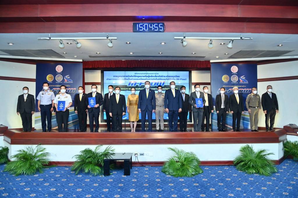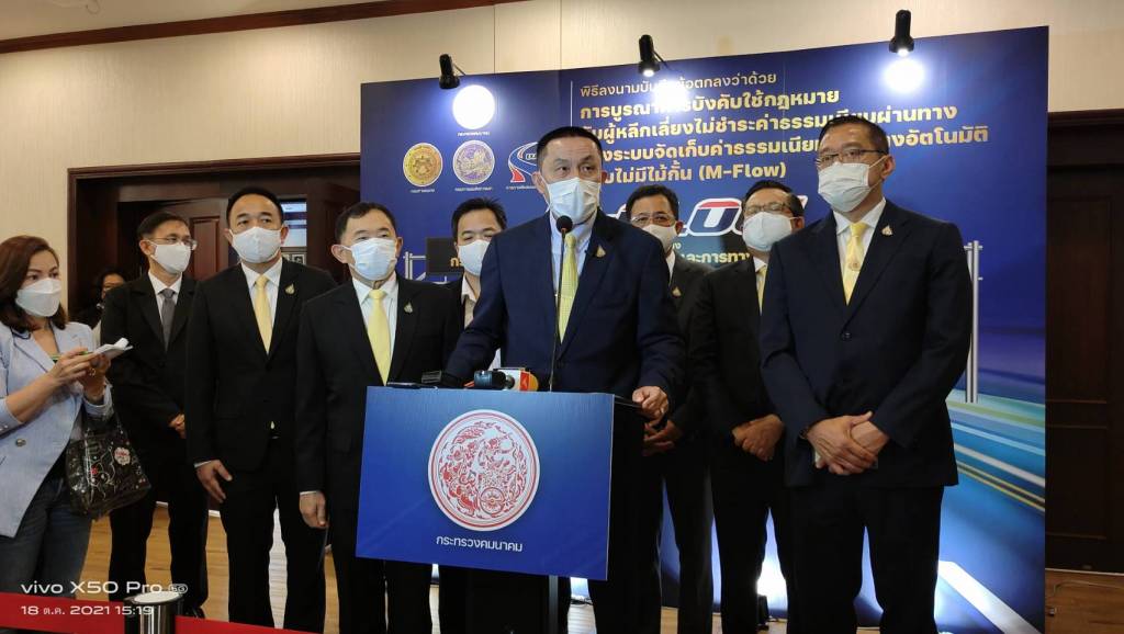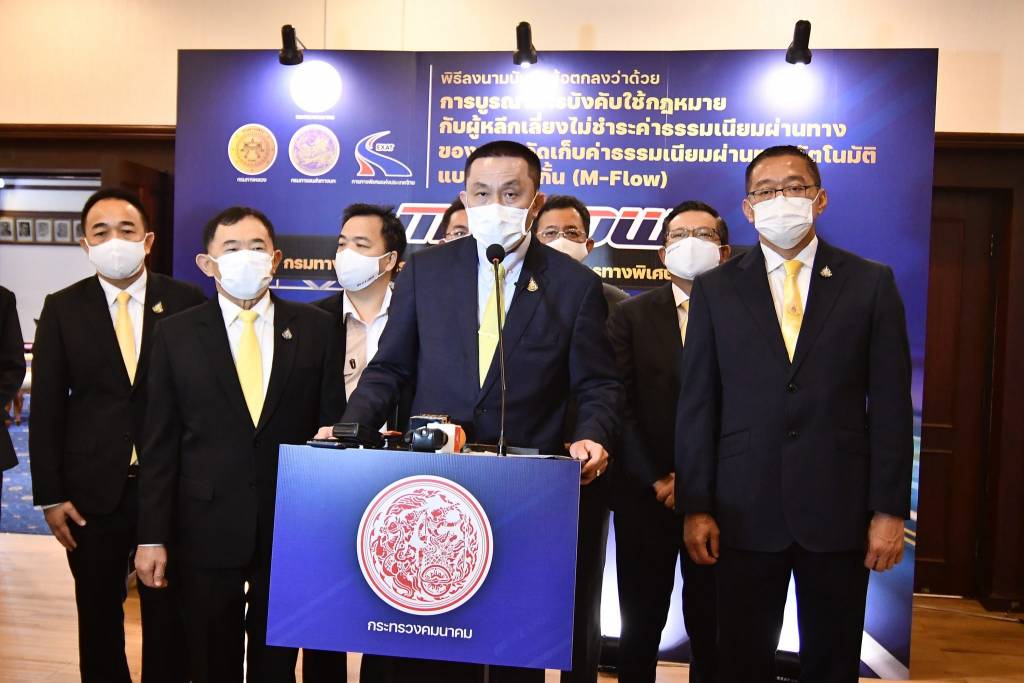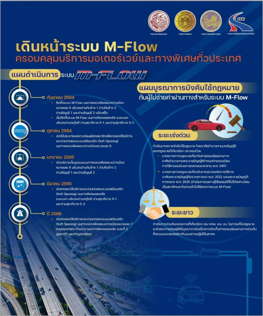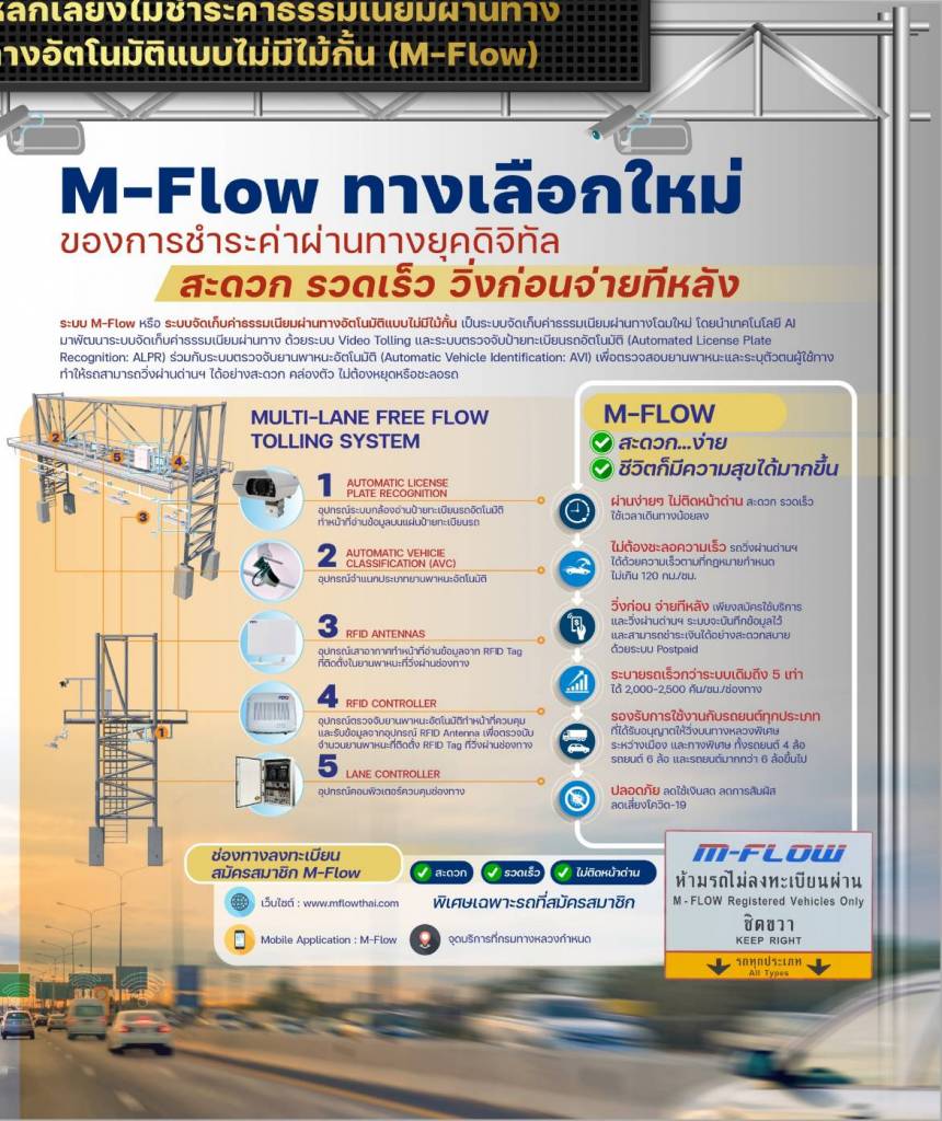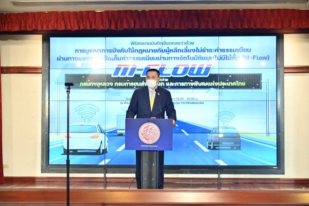 นายศักดิ์สยาม ชิดชอบ รัฐมนตรีว่าการกระทรวงคมนาคม กล่าวว่า กระทรวงคมนาคมมีนโยบายเพิ่มประสิทธิภาพการเดินทางบนท้องถนน โดยเฉพาะบนทางหลวงพิเศษระหว่างเมือง และทางพิเศษ ให้มีความสะดวก รวดเร็ว ปลอดภัย จึงได้มอบหมายให้กรมทางหลวง และการทางพิเศษแห่งประเทศไทย ร่วมกันศึกษา พัฒนาระบบจัดเก็บค่าธรรมเนียมผ่านทางอัตโนมัติแบบไม่มีไม้กั้น (M-Flow) ซึ่งเป็นการนำเทคโนโลยี AI มาใช้จัดเก็บค่าผ่านทาง ด้วยการใช้ระบบ Video Tolling ตรวจจับป้ายทะเบียน ทำให้รถสามารถขับผ่านด่านเก็บเงินได้ โดยไม่ต้องชะลอ ช่วยระบายรถบริเวณหน้าด่านได้เร็วกว่าเดิมถึง 5 เท่าหรือประมาณ 2,000 คัน/ช่อง/ชม. เป็นการบรรเทาปัญหาการจราจรติดขัดบริเวณหน้าด่านและยังช่วยให้ผู้ใช้ทางสามารถใช้ความเร็วต่อเนื่อง 120 กม./ชม. ได้ โดยได้สั่งการให้หน่วยงานในสังกัดกระทรวงคมนาคมบูรณาการการทำงานร่วมกันให้เป็นรูปธรรม และเป็นมาตรฐานเดียวกัน (Single Platform System) ทำให้สามารถใช้กับทางหลวงพิเศษระหว่างเมือง และทางพิเศษได้ทุกเส้นทาง