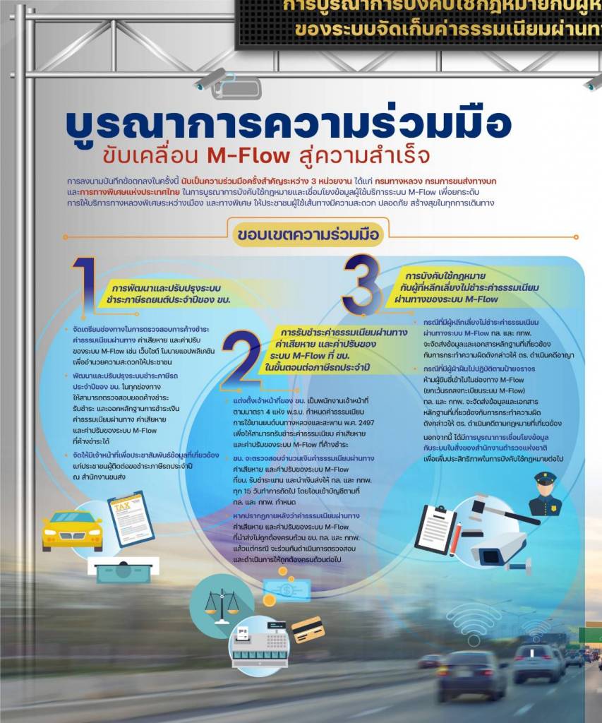 สำหรับการลงนามบันทึกข้อตกลงในครั้งนี้ นับเป็นความร่วมมือครั้งสำคัญระหว่าง กรมทางหลวง กรมการขนส่งทางบก การทางพิเศษแห่งประเทศไทย ในการบูรณาการบังคับใช้กฎหมาย และเชื่อมโยงข้อมูลผู้ใช้บริการระบบ M-Flow โดยมีขอบเขตการดำเนินงานร่วมกัน ได้แก่ การพัฒนา และปรับปรุงระบบชำระภาษีรถยนต์ประจำปีของกรมการขนส่งทางบก โดยการจัดเตรียมช่องทางในการตรวจสอบยอดค้างชำระค่าธรรมเนียมผ่านทาง ค่าเสียหาย และค่าปรับของระบบ M-Flow เพื่ออำนวยความสะดวกให้ประชาชน และปรับปรุงโปรแกรมชำระภาษีของกรมการขนส่งทางบกเพื่อให้สามารถชำระค่าธรรมเนียมผ่านทาง ค่าเสียหาย และค่าปรับของระบบ M-Flow ที่ค้างชำระได้ การรับชำระค่าธรรมเนียมผ่านทาง ค่าเสียหาย และค่าปรับของระบบ M-Flow ที่กรมการขนส่งทางบกในขั้นตอนการต่อภาษีรถประจำปี แต่งตั้งเจ้าหน้าที่ของกรมการขนส่งทางบกเป็นพนักงานเจ้าหน้าที่ตามมาตรา 4 แห่ง พ.ร.บ. กำหนดค่าธรรมเนียมการใช้ยานยนต์บนทางหลวง และสะพาน พ.ศ. 2497 เพื่อให้สามารถรับชำระค่าธรรมเนียม ค่าเสียหาย และค่าปรับของระบบ M-Flow ที่ค้างชำระ โดยกรมการขนส่งทางบก จะเป็นผู้เก็บรักษา และนำส่งเงินค่าธรรมเนียมผ่านทาง ค่าเสียหาย และค่าปรับของระบบ M-Flow ให้กับกรมทางหลวง และการทางพิเศษแห่งประเทศไทย การบังคับใช้กฎหมาย กับผู้ที่หลีกเลี่ยงไปชำระค่าธรรมเนียมผ่านทางของระบบ M-Flow โดยหากมีผู้หลีกเลี่ยงไม่ชำระค่าธรรมเนียมผ่านทาง หรือผู้ที่ไม่เป็นสมาชิกแล้วฝ่าฝืนขับรถเข้าไปในช่องทาง M-Flow กรมทางหลวง และการทางพิเศษแห่งประเทศไทย จะจัดส่งข้อมูล และเอกสารหลักฐานที่เกี่ยวกับการกระทำผิดให้เจ้าหน้าที่ตำรวจ เพื่อดำเนินการตามขั้นตอนที่กำหนดในกฎหมายต่อไป
