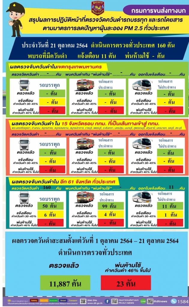วันนี้ (21 ตุลาคม 2564) นายจิรุตม์ วิศาลจิตร อธิบดีกรมการขนส่งทางบก เผยผลการดำเนินการตรวจควันดำรถบรรทุกและรถโดยสารทั่วประเทศ ซึ่งเป็นการดำเนินการต่อเนื่อง ตามนโยบายของนายศักดิ์สยาม ชิดชอบ รัฐมนตรีว่าการกระทรวงคมนาคม เพื่อป้องกันและแก้ไขปัญหาฝุ่นละอองขนาดเล็ก PM2.5 เฉพาะวันที่ 21 ตุลาคม 2564 ดำเนินการตรวจวัดควันดำรถโดยสารและรถบรรทุกทั่วประเทศ จำนวน 160 คัน ไม่พบรถที่มีค่าควันดำเกินเกณฑ์มาตรฐานที่ราชการกำหนด ในขณะที่พบรถที่มีค่าควันดำ 30 - 45 % ได้ออกใบเตือนเพื่อให้ผู้ประกอบการไปบำรุงดูแลรักษารถไม่ให้มีค่าควันดำเกิน จำนวน 11 คัน ส่งผลให้ตั้งแต่วันที่ 1 ตุลาคม 2564 – 21 ตุลาคม 2564 ดำเนินการตรวจควันดำรถทั้งสิ้น 11,887 คัน พ่นห้ามใช้แล้วจำนวน 23 คัน ทั้งนี้ กำชับผู้ประกอบการและเจ้าของรถทุกคันที่ถูกพ่นห้ามใช้ ต้องนำรถไปแก้ไขและนำรถเข้ารับการตรวจสภาพ ณ สำนักงานขนส่ง หากฝ่าฝืนใช้รถโดยที่มีคำสั่งห้ามใช้ มีความผิดตามกฎหมาย ด้านประชาชนสามารถมีส่วนร่วมป้องกันและแก้ไขปัญหาฝุ่นละอองขนาดเล็ก PM2.5 ด้วยการส่งภาพรถบรรทุกและรถโดยสารควันดำที่สังเกตเห็นหมายเลขทะเบียนชัดเจน ให้ศูนย์คุ้มครองผู้โดยสารและรับเรื่องร้องเรียน สายด่วน 1584 ตลอด 24 ชั่วโมง •Line@: @1584DLT •Facebook: 1584 ร้องเรียนรถโดยสารสาธารณะ https://www.facebook.com/dlt1584/ •เว็บไซต์ http://ins.dlt.go.th/cmpweb/ •แอปพลิเคชัน DLT GPS •E-mail: dlt_1584complain@hotmail.com