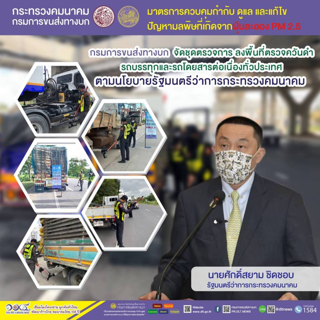 กรมการขนส่งทางบก ตรวจควันดำรถบรรทุกและรถโดยสารต่อเนื่องทั่วประเทศ มุ่งป้องกันและแก้ไขปัญหา PM2.5 เฉพาะ 29 ตุลา พบรถที่มีค่าควันดำ 30-45 % ได้ออกใบเตือนไปบำรุงดูแลรักษา จำนวน 9 คัน จาก 658 คัน