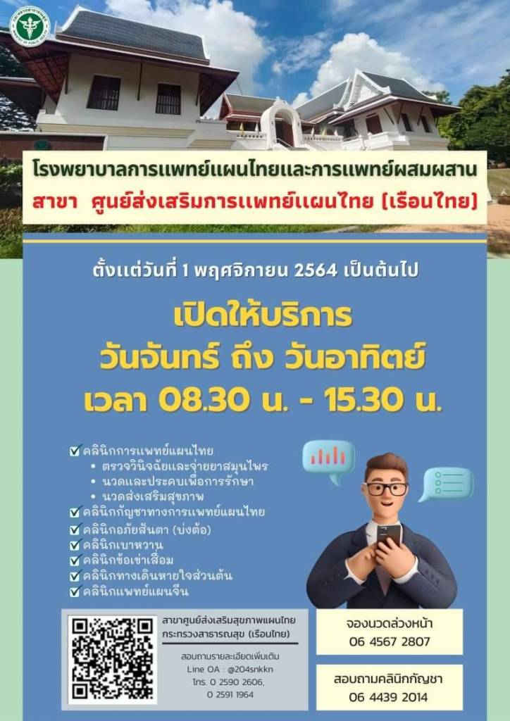 “ช่วง 2-3 เดือนหลัง มีการสอบถามเข้ามามากเรื่องเมื่อไรคลินิกแพทย์แผนไทย จะกลับมาให้บริการ ตรงนี้ ต้องขออภัยเป็นอย่างยิ่งที่จะชะลอการรักษาออกไป เพราะติดปัญหาเรื่องโควิด 19 ซึ่งได้แนะนำไปว่าผู้ป่วยที่ได้รับการรักษาอยู่นั้น สามารถเข้าไปรักษาด้วยการแพทย์แผนปัจจุบันได้ แต่ผู้ที่เคยเข้ารับการรักษา ก็ยังต้องการเข้ามาใช้บริการแพทย์ทางเลือก ซึ่งต้องขอขอบคุณเป็นอย่างยิ่ง ตอนนี้ คลินิกแพทย์แผนไทย กลับมาให้บริการแล้ว ประชาชนสามารถกลับเข้ามาใช้บริการได้ โรคที่อยู่ในข่ายเข้ารับการรักษาได้แก่ 1.พาร์กินสัน (Parkinson) 2.อัลไซเมอร์ (Alzheimer) 3.ปลอกประสาทอักเสบ (Multiple sclerosis) 4.โรควิตกกังวล (Anxiety disorder) 5.มะเร็งระยะสุดท้าย (Cancer, end stage) และ 6.โรคอื่น ๆ ระยะสุดท้าย (Severe diseases, end stage)”