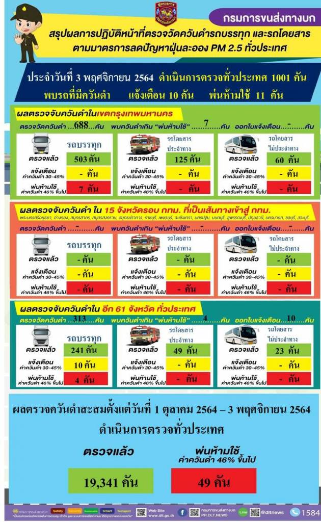 วันนี้ (3 พฤศจิกายน 2564) นายจิรุตม์ วิศาลจิตร อธิบดีกรมการขนส่งทางบก เผยผลการดำเนินการตรวจควันดำรถบรรทุกและรถโดยสารทั่วประเทศ ซึ่งเป็นการดำเนินการต่อเนื่อง ตามนโยบายของนายศักดิ์สยาม ชิดชอบ รัฐมนตรีว่าการกระทรวงคมนาคม เพื่อป้องกันและแก้ไขปัญหาฝุ่นละอองขนาดเล็ก PM 2.5 เฉพาะวันที่ 3 พฤศจิกายน 2564 ดำเนินการตรวจวัดควันดำรถโดยสารและรถบรรทุกทั่วประเทศ จำนวน 1,001 คัน พบรถที่มีค่าควันดำเกินเกณฑ์มาตรฐานที่ราชการกำหนด จำนวน 11 คัน ในขณะที่พบรถที่มีค่าควันดำ 30 - 45 % ได้ออกใบเตือนเพื่อให้ผู้ประกอบการไปบำรุงดูแลรักษารถไม่ให้มีค่าควันดำเกิน จำนวน 10 คัน ส่งผลให้ตั้งแต่วันที่ 1 ตุลาคม 2564 – 3 พฤศจิกายน 2564 ดำเนินการตรวจควันดำรถทั้งสิ้น 19,341 คัน พ่นห้ามใช้แล้วจำนวน 49 คัน ทั้งนี้ กำชับผู้ประกอบการและเจ้าของรถทุกคันที่ถูกพ่นห้ามใช้ ต้องนำรถไปแก้ไขและนำรถเข้ารับการตรวจสภาพ ณ สำนักงานขนส่ง หากฝ่าฝืนใช้รถโดยที่มีคำสั่งห้ามใช้ มีความผิดตามกฎหมาย ด้านประชาชนสามารถมีส่วนร่วมป้องกันและแก้ไขปัญหาฝุ่นละอองขนาดเล็ก PM2.5 ด้วยการส่งภาพรถบรรทุกและรถโดยสารควันดำที่สังเกตเห็นหมายเลขทะเบียนชัดเจน ให้ศูนย์คุ้มครองผู้โดยสารและรับเรื่องร้องเรียน สายด่วน 1584 ตลอด 24 ชั่วโมง •Line@: @1584DLT •Facebook: 1584 ร้องเรียนรถโดยสารสาธารณะ https://www.facebook.com/dlt1584/ •เว็บไซต์ http://ins.dlt.go.th/cmpweb/ •แอปพลิเคชัน DLT GPS •E-mail: dlt_1584complain@hotmail.com