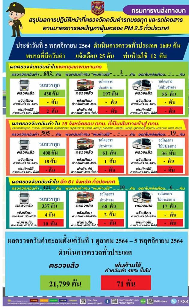 วันนี้ (5 พฤศจิกายน 2564) นายจิรุตม์ วิศาลจิตร อธิบดีกรมการขนส่งทางบก เผยผลการดำเนินการตรวจควันดำรถบรรทุกและรถโดยสารทั่วประเทศ ซึ่งเป็นการดำเนินการต่อเนื่อง ตามนโยบายของนายศักดิ์สยาม ชิดชอบ รัฐมนตรีว่าการกระทรวงคมนาคม เพื่อป้องกันและแก้ไขปัญหาฝุ่นละอองขนาดเล็ก PM 2.5 เฉพาะวันที่ 5 พฤศจิกายน 2564 ดำเนินการตรวจวัดควันดำรถโดยสารและรถบรรทุกทั่วประเทศ จำนวน 1,609 คัน พบรถที่มีค่าควันดำเกินเกณฑ์มาตรฐานที่ราชการกำหนด จำนวน 12 คัน ในขณะที่พบรถที่มีค่าควันดำ 30 - 45 % ได้ออกใบเตือนเพื่อให้ผู้ประกอบการไปบำรุงดูแลรักษารถไม่ให้มีค่าควันดำเกิน จำนวน 25 คัน ส่งผลให้ตั้งแต่วันที่ 1 ตุลาคม 2564 – 5 พฤศจิกายน 2564 ดำเนินการตรวจควันดำรถทั้งสิ้น 21,799 คัน พ่นห้ามใช้แล้วจำนวน 71 คัน ทั้งนี้ กำชับผู้ประกอบการและเจ้าของรถทุกคันที่ถูกพ่นห้ามใช้ ต้องนำรถไปแก้ไขและนำรถเข้ารับการตรวจสภาพ ณ สำนักงานขนส่ง หากฝ่าฝืนใช้รถโดยที่มีคำสั่งห้ามใช้ มีความผิดตามกฎหมาย ด้านประชาชนสามารถมีส่วนร่วมป้องกันและแก้ไขปัญหาฝุ่นละอองขนาดเล็ก PM2.5 ด้วยการส่งภาพรถบรรทุกและรถโดยสารควันดำที่สังเกตเห็นหมายเลขทะเบียนชัดเจน ให้ศูนย์คุ้มครองผู้โดยสารและรับเรื่องร้องเรียน สายด่วน 1584 ตลอด 24 ชั่วโมง •Line@: @1584DLT •Facebook: 1584 ร้องเรียนรถโดยสารสาธารณะ https://www.facebook.com/dlt1584/ •เว็บไซต์ http://ins.dlt.go.th/cmpweb/ •แอปพลิเคชัน DLT GPS •E-mail: dlt_1584complain@hotmail.com