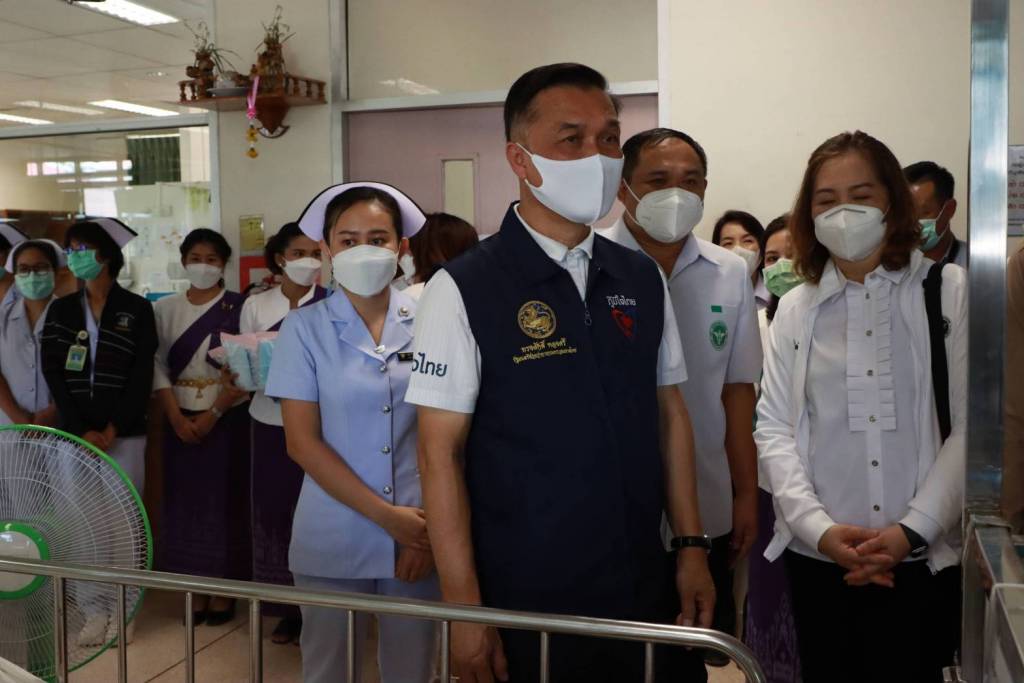 จากนั้น รองนายกรัฐมนตรีและรัฐมนตรีว่าการกระทรวงสาธารณสุข พร้อมคณะได้ตรวจเยี่ยมการให้บริการของโรงพยาบาลบึงกาฬ และเยี่ยมให้กำลังใจพร้อมมอบอาหารเสริมและหน้ากากอนามัยแก่ผู้ป่วยซึ่งรับบริการในตึกศัลยกรรม ชั้นที่ 1 และตรวจการจัดการและการรักษาผู้ป่วยโควิด-19 ที่หอพักผู้ป่วยติดเชื้อ COVID-19 ชนิดเติมอากาศและระบายอากาศ