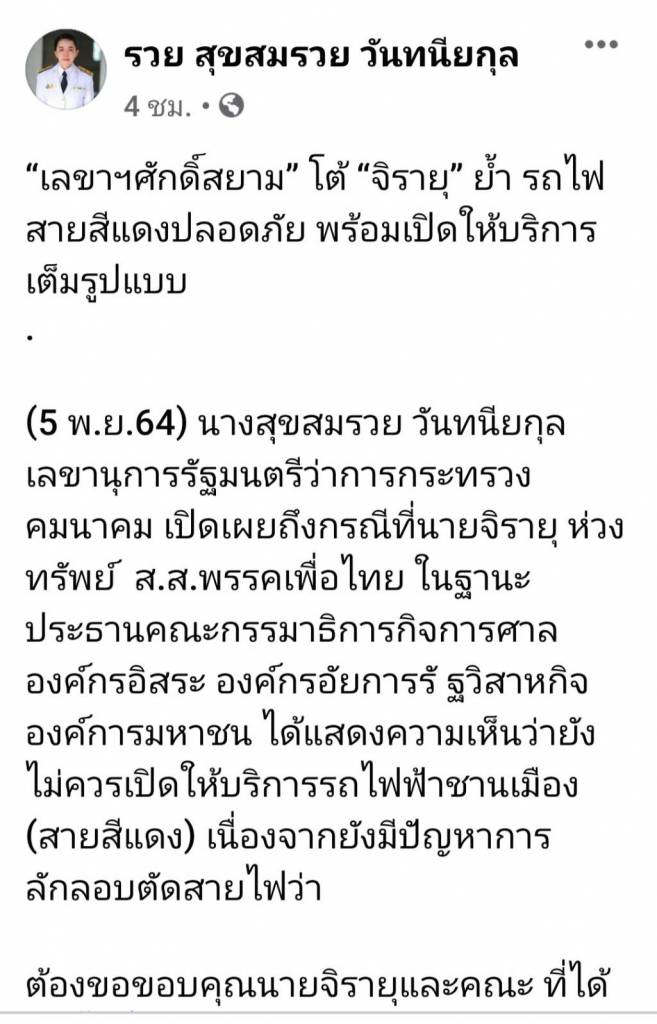 วันที่ 5 พฤศจิกายน 2564 นางสุขสมรวย วันทนียกุล เลขานุการรัฐมนตรีว่าการกระทรวงคมนาคม ได้โพสต์เฟซบุ๊ก ว่า กรณีที่นายจิรายุ ห่วงทรัพย์ ส.ส.พรรคเพื่อไทย ในฐานะประธานคณะกรรมาธิการกิจการศาล องค์กรอิสระ องค์กรอัยการรั ฐวิสาหกิจ องค์การมหาชน ได้แสดงความเห็นว่ายังไม่ควรเปิดให้บริการรถไฟฟ้าชานเมือง (สายสีแดง) เนื่องจากยังมีปัญหาการลักลอบตัดสายไฟว่า