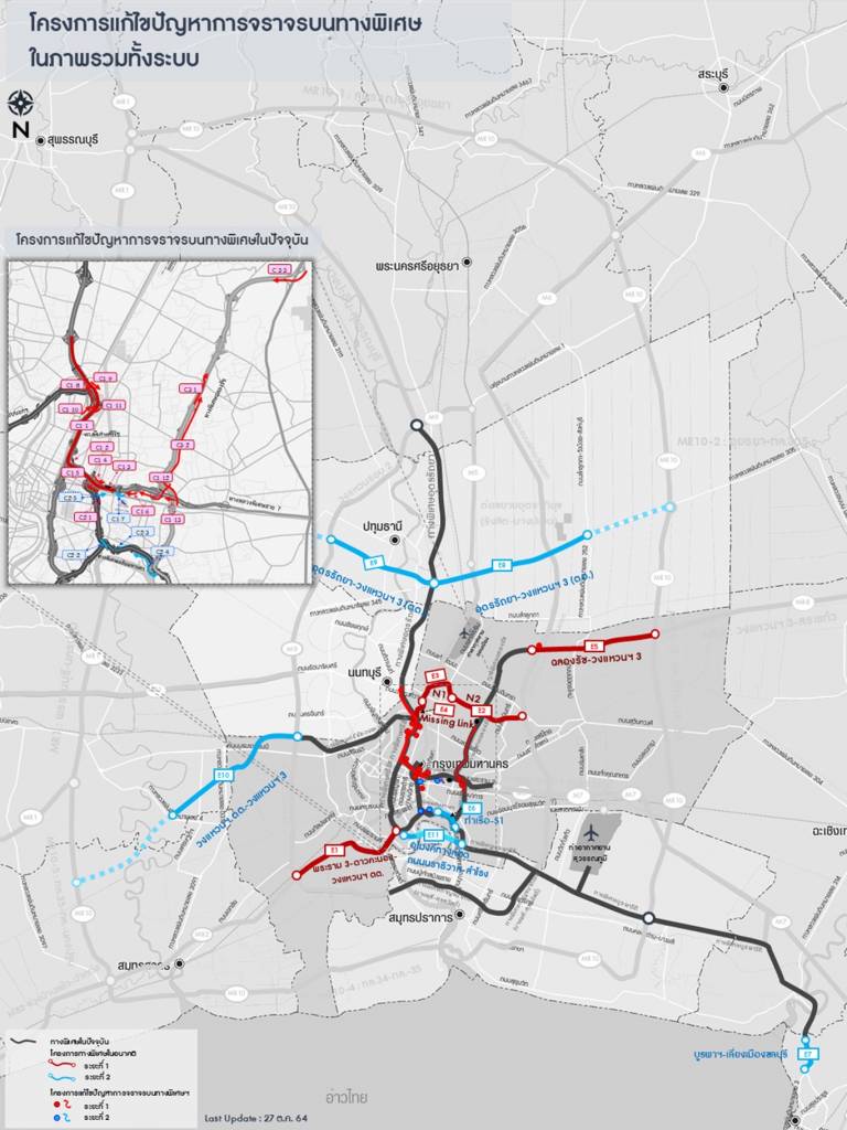ปัจจุบัน การทางพิเศษแห่งประเทศไทยได้ดำเนินการศึกษาวิเคราะห์ปัญหาการจราจรบนโครงข่ายทางพิเศษในภาพรวมทั้งระบบ และได้รายงานผลการศึกษาเบื้องต้นและความคืบหน้าของการศึกษาให้คณะกรรมการจัดระบบการจราจรทางบก (คจร.) รับทราบ ในการประชุมครั้งที่ 2/2564 เมื่อวันที่ 20 กันยายน 2564 ปัจจุบันอยู่ระหว่างการจัดทำแผนการแก้ไขปัญหาฯ มีความก้าวหน้าของการศึกษาประมาณร้อยละ75.05% (ตุลาคม 2564)
