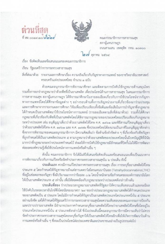 ซึ่งจากการพิจารณาของคณะอนุกรรมาธิการฯ มีความคิดเห็นว่า ข้อห้ามข้อจำกัดต่าง ๆ ที่เกี่ยวข้องกับพืชกัญชาที่ถูกกำหนดให้เป็นยาเสพติดประเภท 5 ตามกฎหมายว่าด้วยยาเสพติดของประเทศไทยนั้นมีบทบัญญัติที่มีนัยมากกว่า ที่กฎหมายระหว่างประเทศกำหนดไว้ ส่งผลให้การบังคับใช้กฎหมายมีลักษณะที่ปิดกั้นไม่ให้มีการพัฒนาต่อยอดองค์ความรู้เพื่อใช้ประโยชน์ทางการแพทย์หรือด้านอื่น ๆ ดังนั้น คณะกรรมาธิการ จึงได้มีมติให้เสนอข้อคิดเห็น และข้อเสนอแนะเพื่อเป็นแนวทางการพิจารณาเกี่ยวกับการแก้ไขหรือจัดทำประกาศกระทรวงสาธารณสุขใน 2 ประเด็น ดังนี้