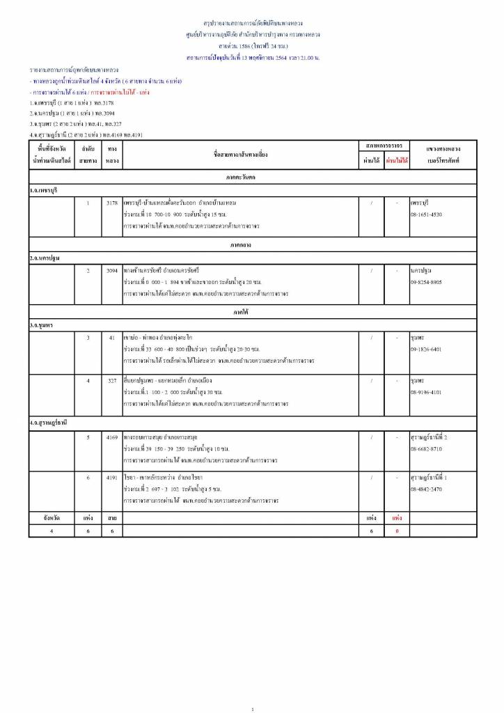 13 พฤศจิกายน 2564 เวลา 22:41กรมทางหลวงรายงานสถานการณ์ น้ำท่วม และดินสไลด์ ในโครงข่ายทางหลวงตามนโยบาย นายศักดิ์สยาม ชิดชอบ รัฐมนตรีว่าการกระทรวงคมนาคม วันเสาร์ที่ 13 พ.ย. 2564 เวลา 21.00 น.กรมทางหลวงรายงานสถานการณ์ น้ำท่วม และดินสไลด์ ในโครงข่ายทางหลวงตามนโยบาย นายศักดิ์สยาม ชิดชอบ รัฐมนตรีว่าการกระทรวงคมนาคม วันเสาร์ที่ 13 พฤศจิกายน 2564 เวลา 21.00 น. ดังนี้ น้ำท่วม/ดินสไลด์ 4 จังหวัด รวม 6 แห่ง การจราจรผ่านได้ 6 แห่ง ผ่านไม่ได้ - แห่ง 1.จ.เพชรบุรี ( 1 แห่ง) - การจราจรผ่านได้ 1 แห่ง - การจราจรผ่านไม่ได้ – แห่ง 2.จ.นครปฐม ( 1 แห่ง) - การจราจรผ่านได้ 1 แห่ง - การจราจรผ่านไม่ได้ – แห่ง 3.จ.ชุมพร ( 2 แห่ง) - การจราจรผ่านได้ 2 แห่ง - การจราจรผ่านไม่ได้ - แห่ง 4.จ.สุราษฎร์ธานี ( 2 แห่ง) - การจราจรผ่านได้ 2 แห่ง - การจราจรผ่านไม่ได้ - แห่ง แชร์บทความนี้: