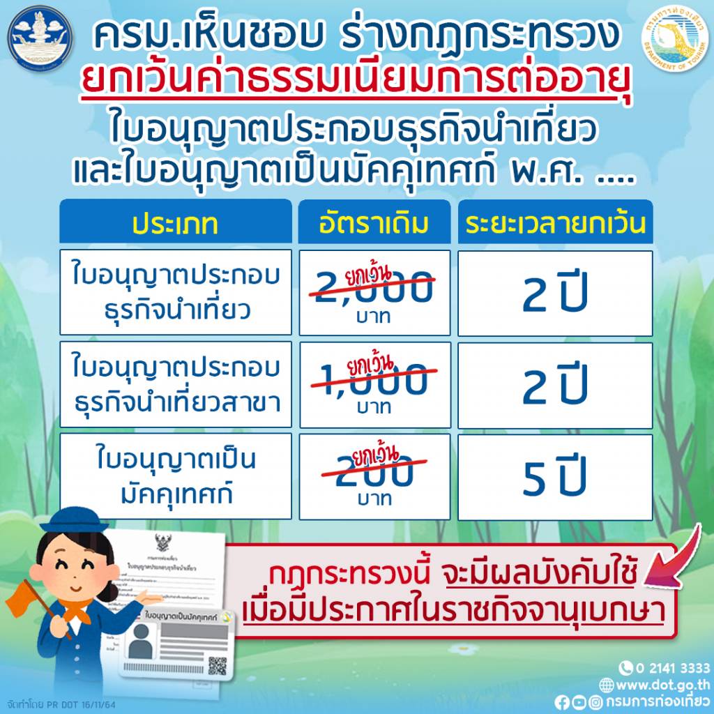 กระทรวงการท่องเที่ยวและกีฬา โดยกรมการท่องเที่ยว มีความเข้าใจในผลกระทบจากสถานการณ์การแพร่ระบาดของโรคติดเชื้อไวรัสโคโรนา 2019 (COVID-19)ที่ทำให้ธุรกิจการท่องเที่ยวเกิดความชะงัก ผู้ประกอบธุรกิจนำเที่ยวและมัคคุเทศก์ขาดสภาพคล่องทางการเงินอย่างหนัก ขาดรายได้แต่ยังต้องรับผิดชอบค่าใช้จ่ายที่จำเป็นต่อการประกอบธุรกิจหรือประกอบอาชีพ ดังนั้น เพื่อเป็นการบรรเทาภาระค่าใช้จ่ายของผู้ประกอบธุรกิจนำเที่ยวและมัคคุเทศก์ในระยะเร่งด่วน ให้สามารถหล่อเลี้ยงธุรกิจและประกอบอาชีพในภาวะวิกฤตได้ คณะกรรมการธุรกิจนำเที่ยวและมัคคุเทศก์ ในคราวการประชุมครั้งที่ 4/2564 เมื่อวันที่ 2 สิงหาคม 2564 ได้มีมติเห็นชอบการยกเว้นค่าธรรมเนียมการต่ออายุใบอนุญาตประกอบธุรกิจนำเที่ยวและใบอนุญาตเป็นมัคคุเทศก์ตามพระราชบัญญัติธุรกิจนำเที่ยวและมัคคุเทศก์ พ.ศ. 2551 ลงชั่วคราว โดยร่างกฎกระทรวงยกเว้นค่าธรรมเนียมการต่ออายุใบอนุญาตประกอบธุรกิจนำเที่ยว และใบอนุญาตเป็นมัคคุเทศก์ พ.ศ. .... เสนอคณะรัฐมนตรีผ่านรัฐมนตรีว่าการกระทรวงการท่องเที่ยวและกีฬา ซึ่งมีสาระสำคัญ ดังนี้